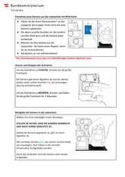 Entnahme einer Kamera aus der Ladeschale mit RFID-Karte ● Halten Sie die Ihren Dienstausweis* an das Lesegerät, bis es piept. Ihnen wird nun eine Kamera zugewiesen. ● Die obere Leuchte leuchtet rot, die vordere Leuchte blinkt grün und die Kamera piept wiederholt. ● Nehmen Sie Ihre Kamera aus der Ladeschale - Sie hören einen Piepton, wenn Sie sie herausnehmen. ● Die Kamera ist nun aufnahmebereit. *Der Dienstausweis muss dazu im VideoManager-System registriert sein! Starten und Stoppen der Aufnahme Um die Aufnahme zu STARTEN, drücken Sie die große Fronttaste. Die Kamera gibt einen Signalton ab und die oberen beiden roten Lichter leuchten rot, um anzuzeigen, dass die Aufnahme läuft. Um die Aufnahme zu BEENDEN, drücken und halten Sie die große Fronttaste für 3 Sekunden. Rückgabe der Kamera in die Ladeschale Wählen Sie einen beliebigen freien Steckplatz. STELLEN SIE SICHER, DASS DIE KAMERA SENKRECHT UND NACH VORNE GERICHTET IST. Sobald die Kamera angedockt ist, gibt sie einen Signalton ab. Alle Leuchten werden grün, die untere Leuchte blinkt, um anzuzeigen, dass Videos in die zentrale Infrastruktur hochgeladen werden. Durch das Andocken wird die Kamera auch wieder aufgeladen.