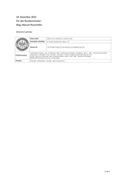 2 von 2 19. Dezember 2025 Für den Bundesminister: Mag. Manuel Nussmüller Elektronisch gefertigt Datum/Zeit 2025-12-19T08:57:28+01:00 Aussteller-Zertifikat a-sign-premium-seal-10 Serien-Nr. 7574780474501573478350112748982152125 Prüfinformation Informationen zur Prüfung des elektronischen Siegels bzw. der elektronischen Signatur finden Sie unter: https://www.signaturpruefung.gv.at Eine Verifizierung des Ausdruckes kann bei der ausstellenden Behörde/Dienststelle erfolgen. Hinweis Dieses Dokument wurde amtssigniert.