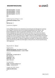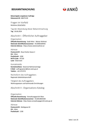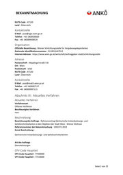 BEKANNTMACHUNG Seite 1 von 25 Bekanntgabe vergebener Aufträge Dokument-ID: 186274-00 Fragen im Vorfeld Richtlinie 2014/24/EU Tag der Absendung dieser Bekanntmachung Tag : 26.06.2024 Abschnitt I : Öffentlicher Auftraggeber Organisation Offizielle Bezeichnung : Stadt Wien - Wiener Wohnen Nationale Identifikationsnummer : 9110006184442 Internet-Adresse : https://www.wienerwohnen.at Adresse Postanschrift : Rosa-Fischer-Gasse 2 Ort : Wien Postleitzahl : 1030 NUTS-Code : AT130 Land : Österreich Kontaktstelle Kontaktstelle(n) : Dezernat Rahmenverträge E-Mail : auftragswesen@wrw.wien.gv.at Telefon : +43 5757575 Rechtsform des Auftraggebers Regionale Gebietskörperschaft Tätigkeit des Auftraggebers Wohnungswesen und kommunale Einrichtungen Abschnitt II : Organisations-Katalog Organisation Offizielle Bezeichnung : Verwaltungsgericht Wien Nationale Identifikationsnummer : 9110019835300 Internet-Adresse : http://www.verwaltungsgericht.wien.gv.at Adresse Postanschrift : Muthgasse 62 Ort : Wien Postleitzahl : 1190