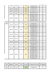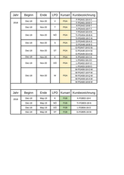 Jahr Beginn Ende LPD Kursart Kursbezeichnung 2018 Dec-18 Nov-20 V PGA F-PGA41-18-A-V F-PGA61-18-B-V Dec-18 Nov-20 T PGA A-PGA42-18-B-T A-PGA43-18-F-T Dec-18 Nov-20 NÖ PGA Y-PGA44-18-A-N Tr-PGA54-18-B-N Tr-PGA55-18-C-N Dec-18 Nov-20 S PGA G-PGA45-18-A-S G-PGA46-18-B-S Dec-18 Nov-20 ST PGA G-PGA47-18-G-St G-PGA48-18-H-St G-PGA49-18-A-St Dec-18 Nov-20 K PGA K-PGA50-18-C-K Dec-18 Nov-20 OÖ PGA L-PGA51-18-J-O L-PGA52-18-F-O L-PGA53-18-B-O Dec-18 Nov-20 W PGA W-PGA56-18-O-W W-PGA57-18-P-W W-PGA58-18-Q-W W-PGA59-18-A-W W-PGA60-18-B-W Jahr Beginn Ende LPD Kursart Kursbezeichnung 2018 Dec-18 May-19 K FGB K-FGB02-18-K Dec-18 May-19 NÖ FGB Tr-FGB03-18-N Dec-18 May-19 OÖ FGB L-FGB04-18-O Dec-18 May-19 ST FGB G-FGB05-18-St