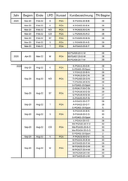 Jahr Beginn Ende LPD Kursart Kursbezeichnung TN Beginn 2019 Jan-19 Dec-20 S PGA L-PGA02-19-A-S 28 2019 Mar-19 Feb-21 ST PGA G-PGA03-19-B-St 29 Mar-19 Feb-21 OÖ PGA L-PGA04-19-G-O 28 Mar-19 Feb-21 T PGA L-PGA05-19-A-T 28 Mar-19 Feb-21 NÖ PGA Tr-PGA06-19-D-N 30 Mar-19 Feb-21 W PGA W-PGA07-19-C-W 28 W-PGA08-19-D-W 29 2019 May-19 Apr-21 ST PGA G-PGA09-19-St 28 May-19 Apr-21 S PGA Gr-PGA10-19-B-S 29 May-19 Apr-21 T PGA Gr-PGA10-19-B-S 1 May-19 Apr-21 K PGA K-PGA11-19-D-K 28 May-19 Apr-21 OÖ PGA L-PGA12-19-C-O 27 May-19 Apr-21 W PGA W-PGA13-19-E-W 27 W-PGA14-19-F-W 29 May-19 Apr-21 NÖ PGA Y-PGA15-19-E-N 29 2019 Jun-19 May-21 B PGA E-PGA16-19-C-B 29 Jun-19 May-21 K PGA K-PGA17-19-A-K 28 Jun-19 May-21 NÖ PGA Y-PGA18-19-B-N 28 Tr-PGA28-19-E-N 28 Jun-19 May-21 OÖ PGA L-PGA19-19-D-O 28 L-PGA20-19-E-O 28 Jun-19 May-21 S PGA L-PGA21-19-B-S 28 Jun-19 May-21 ST PGA G-PGA22-19-D-St 29 Jun-19 May-21 T PGA A-PGA23-19-C-T 28 Jun-19 May-21 V PGA F-PGA24-19-D-V 32 Jun-19 May-21 W PGA W-PGA25-19-G-W 29 W-PGA26-19-H-W 29 W-PGA27-19-I-W 28 2019 Sep-19 Aug-21 B PGA E-PGA29-19-A-B 30 Sep-19 Aug-21 K PGA K-PGA30-19-B-K 28 Sep-19 Aug-21 NÖ PGA Y-PGA31-19-C-N 28 Y-PGA32-19-D-N 29 Tr-PGA42-19-A-N 29 Sep-19 Aug-21 ST PGA G-PGA33-19-E-St 29