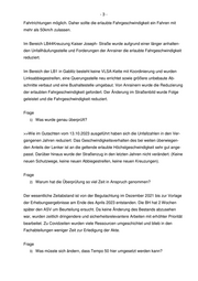- 3 - Fahrtrichtungen möglich. Daher sollte die erlaubte Fahrgeschwindigkeit ein Fahren mit mehr als 50km/h zulassen. Im Bereich LB44Kreuzung Kaiser Joseph- Straße wurde aufgrund einer länger anhalten- den Unfallhäufungsstelle und Forderungen der Anrainer die erlaubte Fahrgeschwindigkeit reduziert. Im Bereich der LB1 in Gablitz besteht keine VLSA-Kette mit Koordinierung und wurden Linksabbiegestreifen, eine Querungsstelle neu errichtet sowie größere unbebaute Ab- schnitte verbaut und eine Bushaltestelle umgebaut. Von Anrainern wurde die Reduzierung der erlaubten Fahrgeschwindigkeit gefordert. Der Änderung im Straßenbild wurde Folge geleistet und die Fahrgeschwindigkeit reduziert. Frage 1) Was wurde genau überprüft? >>Wie im Gutachten vom 13.10.2023 ausgeführt haben sich die Unfallzahlen in den Ver- gangenen Jahren reduziert. Das Geschwindigkeitsverhalten des bei weiten überwiegen- den Anteils der Lenker ist an die geltende erlaubte Höchstgeschwindigkeit sehr gut ange- passt. Darüber hinaus wurde der Straßenzug in den letzten Jahren nicht verändert. (Keine neuen Schutzwege, keine neuen Abbiegestreifen, keine neuen Kreuzungen). Frage 2) Warum hat die Überprüfung so viel Zeit in Anspruch genommen? Der wesentliche Zeitabstand ist von der Begutachtung im Dezember 2021 bis zur Vorlage der Erhebungsergebnisse am Ende des Aprils 2023 entstanden. Die BH hat 2 Wochen später den ASV um Beurteilung ersucht. Da keine Änderung des Bestands abzusehen war, wurden zeitlich dringendere und sicherheitsrelevantere Arbeiten mit erhöhter Priorität bearbeitet. Zu Covidzeiten wurden viele Ressourcen umgeschichtet und blieb in den Fachabteilungen weniger Zeit zur Erledigung der Akte. Frage 3) Was müsste sich ändern, dass Tempo 50 hier umgesetzt werden kann?