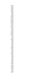 33.3% 7.7% 34.2% 14.6% 16.7% 16.7% 24.3% 0.0% 0.0% 15.7% 0.0% 0.0% 0.0% 8.1% 0.0% 0.0% 0.0% 7.1% 0.0% 0.0% 0.0% 0.0% 13.8% 0.0% 0.0% 7.0% 0.0% 0.0% 20.0% 9.1% 0.0% 9.5% 14.3% 7.3% 34.3% 7.4% 33.3% 18.2% 36.4% 0.0% 0.0% 0.0% 0.0% 0.0% 0.0% 42.0% 16.7% 25.0%