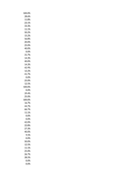 100.0% 25.0% 15.8% 9.1% 25.0% 0.0% 23.1% 51.2% 27.0% 33.3% 42.9% 26.7% 0.0% 0.0% 19.4% 0.0% 0.0% 0.0% 38.6% 24.0% 17.6% 25.0% 28.0% 0.0% 0.0% 33.3% 23.1% 18.2% 11.1% 34.7% 21.3% 18.2% 40.0% 12.5% 39.7% 0.0% 18.8% 41.2% 26.7% 39.6% 18.8% 34.4% 16.7% 0.0% 20.0% 18.2% 18.2% 0.0%