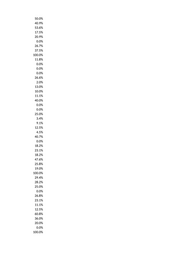 0.0% 16.1% 29.4% 15.8% 29.1% 6.3% 18.2% 66.7% 40.0% 0.0% 100.0% 10.0% 0.0% 54.5% 0.0% 0.0% 0.0% 0.0% 41.2% 0.0% 10.5% 0.0% 15.4% 0.0% 12.2% 17.6% 6.1% 37.3% 21.7% 27.5% 0.0% 23.7% 0.0% 50.0% 25.5% 26.5% 33.3% 20.0% 41.9% 16.7% 6.3% 27.3% 33.3% 42.4% 18.4% 17.1% 0.0% 27.0%