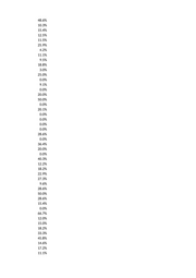 48.4% 0.0% 0.0% 5.3% 9.7% 31.5% 1.4% 12.8% 0.0% 5.9% 19.0% 20.0% 0.0% 5.9% 0.0% 0.0% 7.4% 29.4% 16.1% 14.8% 20.0% 17.6% 28.6% 0.0% 20.0% 20.0% 0.0% 0.0% 44.6% 11.1% 11.8% 23.1% 9.5% 48.3% 11.9% 30.8% 55.6% 38.5% 25.0% 33.3% 22.2% 26.3% 0.0% 14.3% 41.1% 18.5% 7.1% 60.0%