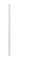17.5% 0.0% 0.0% 6.5% 0.0% 0.0% 40.0% 24.7% 4.5% 5.1% 3.8% 0.0% 26.1% 0.0% 7.3% 6.7% 2.9% 0.0% 0.0% 1.3% 21.7% 0.0% 0.0% 48.5% 0.0% 21.1% 42.4% 14.9% 50.6% 14.8% 31.0% 0.0% 0.0% 20.0% 0.0% 33.3% 36.8% 23.3% 32.0% 28.1% 51.0% 13.5% 24.1% 0.0% 18.8% 22.0% 10.0% 33.3%