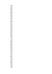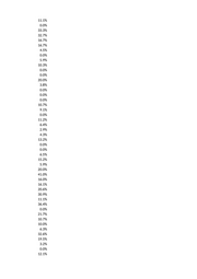 11.1% 0.0% 33.3% 32.7% 16.7% 16.7% 4.5% 0.0% 5.9% 10.3% 0.0% 0.0% 20.0% 3.8% 0.0% 0.0% 0.0% 10.7% 9.1% 0.0% 11.2% 6.4% 2.9% 4.3% 13.2% 0.0% 0.0% 6.5% 15.2% 5.9% 20.0% 41.0% 16.0% 16.1% 20.6% 30.9% 11.1% 36.4% 0.0% 21.7% 10.7% 10.0% 6.3% 32.6% 19.5% 3.2% 0.0% 12.1%