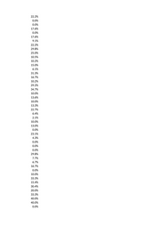 22.2% 0.0% 0.0% 17.6% 0.0% 17.6% 9.1% 22.2% 29.8% 25.0% 10.5% 10.2% 15.0% 6.1% 31.3% 16.7% 10.2% 29.2% 34.7% 10.0% 13.6% 10.0% 13.3% 22.7% 6.4% 2.1% 10.0% 13.0% 0.0% 23.1% 4.3% 0.0% 0.0% 0.0% 29.8% 7.7% 6.7% 16.7% 0.0% 10.0% 33.3% 15.4% 30.4% 20.0% 33.3% 40.0% 40.0% 0.0%