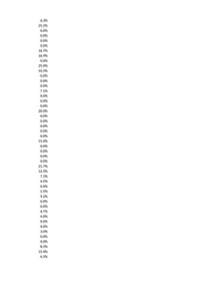 6.3% 25.2% 0.0% 0.0% 0.0% 0.0% 16.7% 16.9% 0.0% 25.0% 33.3% 0.0% 0.0% 0.0% 7.1% 0.0% 0.0% 0.0% 20.0% 0.0% 0.0% 0.0% 0.0% 0.0% 15.4% 0.0% 0.0% 0.0% 0.0% 21.7% 12.5% 7.1% 4.5% 0.0% 2.5% 9.2% 0.0% 0.0% 6.7% 4.0% 0.0% 0.0% 3.0% 0.0% 0.0% 8.3% 15.4% 6.3%