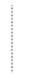 0.0% 0.0% 22.8% 3.8% 8.5% 7.9% 13.5% 0.0% 25.0% 4.7% 0.0% 0.0% 12.6% 0.0% 0.0% 0.0% 0.0% 0.0% 0.0% 0.0% 0.0% 25.0% 26.3% 0.0% 0.0% 25.0% 0.0% 12.5% 0.0% 0.0% 28.8% 0.0% 0.0% 22.2% 14.3% 0.0% 0.0% 0.0% 0.0% 11.7% 0.0% 9.1% 25.0% 0.0% 31.0% 0.0% 40.0% 66.7%