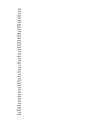 0.0% 0.0% 0.0% 22.2% 0.0% 30.8% 75.0% 50.0% 58.0% 20.0% 0.0% 28.6% 50.0% 39.0% 12.5% 50.0% 10.0% 49.6% 10.0% 0.0% 0.0% 44.9% 0.0% 0.0% 50.0% 0.0% 0.0% 5.9% 16.7% 0.0% 50.7% 0.0% 15.4% 14.3% 12.5% 0.0% 0.0% 0.0% 0.0% 25.0% 0.0% 0.0% 0.0% 12.1% 0.0% 100.0% 0.0% 47.0%