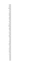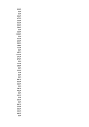 25.0% 23.5% 33.3% 15.4% 0.0% 12.5% 41.8% 0.0% 0.0% 0.0% 14.3% 33.3% 0.0% 0.0% 50.0% 50.0% 0.0% 0.0% 0.0% 0.0% 28.6% 0.0% 0.0% 34.2% 0.0% 7.1% 12.5% 16.7% 4.8% 15.0% 11.1% 0.0% 41.1% 0.0% 50.0% 33.3% 33.3% 50.0% 55.6% 0.0% 50.0% 0.0% 29.3% 0.0% 10.0% 8.7% 100.0% 27.3%