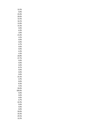 19.5% 4.3% 7.4% 26.7% 9.1% 0.0% 28.6% 4.3% 0.0% 0.0% 33.7% 0.0% 0.0% 0.0% 0.0% 0.0% 7.1% 0.0% 0.0% 25.8% 0.0% 5.3% 0.0% 0.0% 0.0% 16.2% 0.0% 0.0% 0.0% 17.6% 0.0% 10.0% 6.3% 0.0% 0.0% 17.8% 0.0% 4.3% 8.3% 12.5% 0.0% 0.0% 0.0% 0.0% 0.0% 0.0% 11.3% 0.0%