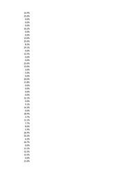 14.9% 25.0% 0.0% 0.0% 0.0% 10.2% 0.0% 0.0% 13.0% 25.0% 8.3% 29.1% 0.0% 12.5% 0.0% 0.0% 25.0% 13.0% 3.0% 5.0% 0.0% 20.0% 11.8% 0.0% 0.0% 0.0% 0.0% 12.1% 0.0% 9.1% 14.3% 0.0% 18.9% 3.7% 11.1% 7.7% 8.0% 5.9% 26.9% 33.3% 6.3% 26.7% 0.0% 11.1% 12.5% 12.5% 0.0% 21.0%