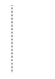 25.0% 0.0% 51.7% 0.0% 0.0% 0.0% 0.0% 18.2% 0.0% 48.4% 0.0% 10.0% 0.0% 0.0% 0.0% 0.0% 25.0% 8.3% 47.1% 50.0% 14.3% 53.4% 50.0% 19.0% 0.0% 0.0% 42.4% 21.4% 0.0% 20.0% 45.1% 0.0% 4.3% 0.0% 0.0% 41.1% 0.0% 0.0% 43.7% 9.1% 7.7% 0.0% 11.1% 0.0% 0.0% 0.0% 25.0% 55.6%