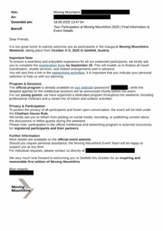 Von: Moving Mountains iii An: U U Gesendet am: 18.09.2025 13:47:54 Your Participation at Moving MountAlns 2025 | Final Information & Betreff: Event Details Dear Friends, It is our great honor to warmly welcome you as participants in the inaugural Moving MountAlns Weekend, taking place from October 2-5, 2025 in Seefeld, Austria. Important Note To ensure a seamless and enjoyable experience for all our esteemed participants, we kindly ask you to complete the registration form by September 19. This will enable us to finalize all travel coordination, shuttle services, and related arrangements well in advance. You will also find a link to the networking activities; it is important that you indicate your personal selection to help us with our planning. Program & Sessions The official program is already available on our website (password: , While the detailed agenda for the intellectual sessions will be announced shortly before the event. For our young guests, we have organized a dedicated program throughout the weekend, including professional childcare and a varied mix of indoor and outdoor activities. Privacy & Participation To protect the privacy of all participants and foster open conversation, the event will be held under the Chatham House Rule. We kindly ask you to refrain from posting on social media, recording, or publishing content about the discussions or fellow guests during the weekend. Please note: participation in the official intellectual and networking program is reserved exclusively for registered participants and their partners. Further Information More details are available on the official event website. Should you require personal assistance, the Moving MountAlns Event Team will be happy to support you at any time. For individual requests, please contact us directly [| i We very much look forward to welcoming you to Seefeld this October for an inspiring and memorable first edition of Moving MountAlns. Best — Moving MountAlns