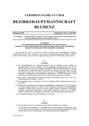 www.ris.bka.gv.at VERORDNUNGSBLATT DER BEZIRKSHAUPTMANNSCHAFT BLUDENZ Jahrgang 2025 Ausgegeben am 16. Juli 2025 7. Verordnung: Zulassung einer Ausnahme von den Geboten und Verboten für das Jagen sowie von der ganzjährigen Schonzeit betreffend den Wolf Verordnung der Bezirkshauptmannschaft Bludenz über die Zulassung einer Ausnahme von den Geboten und Verboten für das Jagen sowie von der ganzjährigen Schonzeit betreffend den Wolf (Ausnahmeverordnung) Auf Grund der §§ 27 Abs. 3 , 4 und 6 sowie § 36 Abs. 2 und § 66 Abs. 4 des Jagdgesetzes , LGBl.Nr. 32/1988 idgF, iVm § 2 Abs. 3 und §§ 4, 5 und 6 Abs. 1 der Wolfsmanagementverordnung – WMVO, LGBl.Nr. 30/2024 idgF, sowie § 20 lit h der Jagdverordnung, LGBl. Nr. 24/1995 idgF, wird verordnet: § 1 Ausnahme (1) Zur Aufrechterhaltung der Alpbewirtschaftung sowie der Verhütung ernster Schäden an Nutztierbeständen wird eine Ausnahme von der ganzjährigen Schonung für jenes Tier der Art Wolf (Canis lupus), welches im Jagdgebiet Eigenjagd Gaßneralpe, Gemeindeg ebiet St. Gerold der Wildregion 1.1 (Großes Walsertal) am 12.07.2025 zwei Ziegen verletzt sowie am 13.07.2025 drei Ziegen verletzt und eine Ziege getötet hat , sowie im Eigenjagdgebiet Alpila (Großes Walsertal), Gemeindegebiet Thüringerberg der Wildregion 1 .1 (Großes Walsertal) ein Schaf verletzt und zwei Schafe getötet sowie am 13.07.2025 ein Schaf getötet hat, zugelassen. (2) Der im Abs. 1 beschriebene Wolf (Canis lupus) gilt als Schadwolf im Sinne des § 2 Abs 3 der Wolfsmanagementverordnung – WMVO. (3) Die Ausnahme gilt bis zur Erlegung des in Abs. 1 genannten Wolfes, längstens jedoch bis zum 30.09.2025. (4) Örtlich gilt die Ausnahme für die Genossenschaftsjagdgebiete Thüringerberg I und II, Thüringen, St. Gerold, Raggal, Nüziders II, Ludesch I und II, Blud esch, Blons und die Eigenjagdgebiete Tschöppen, Tiefensee -Klesi, Tiefensee -Els, Sera, Sentum, Plansott, Hinterkamm, Gassneralpe, Gampelin, Fras senwald, Bludescherau, Alpila (Großes Walsertal), sowie für die im Bezirk Bludenz liegenden Teile der Jagdgebiete Alpe Probst, Alpe Frutz und Agtenwald-Neugerach. (5) Als geeignete Maßnahme wird die Entnahme (§ 2) bestimmt. § 2 Entnahme (1) Die Entnahme hat unter Verwendung folgender Waffen und Munition zu erfolgen: Für den Abschuss des Wolfes (§ 1) sind Jagdgewehre mit einem Kaliber von mindestens 6 mm zu verwenden. Es darf nur Munition verwendet werden, die eine Mindestauftreffenergie von 2.000 Joule hat und mit einem Teilzerlegungs- oder Deformationsgeschoß ausgestattet ist.