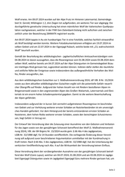 Erläuternde Bemerkungen zur Verordnung der Bezirkshauptmannschaft Bregenz über eine Änderung der Verordnung über die Zulassung einer Ausnahme von den Geboten und Verboten für das Jagen sowie von der Schonzeit betreffend den Wolf (1. Maßnahmeverordnung 2024) I. Allgemeines: 1. Ziel und wesentlicher Inhalt: Am Abend des 01.08.2024 wurde vom Hirten der Alpe Süns, Gemeindegebiet Dornbirn, ein Rind tot aufgefunden, das seit einem Tag abgängig war. Der Hirte vermutete als Todesursache ein Großraubwild. Der wildökologische - jagdwirtschaftliche Amtssachverständige führte am 02.08.2024 eine Begutachtung vor Ort durch. Der Hirte berichtete diesem bereits im Vorfeld, dass er auch in der vergangenen Nacht (von 1. auf 2. August) gegen 02:30 eine große Unruhe in der ca. 180 Stück umfassenden Rinderherde be- merkt hätte und dass die Tiere „im Kreis“ gerannt wären. Wegen der Dunkelheit konnte er den Grund dafür aber nicht ausmachen, wenngleich er auf Grund des aufgefundenen Tierkadavers vom Vorabend ein Raubtier als Ursache vermutete. Beim toten Tier handelt es sich um ein knapp 1,5 Jahre altes Jungrind. Im Zuge der Begutachtung konnte ein weiteres Rind mit Bissverletzungen am Schwanz, an Hinterbeinen sowie Kratz- und Risswunden zwischen den Beinen festgestellt werden. Am Abend des 03.08.2024 hat der Hirte der Alpe Süns abermals ein abgängiges Rind tot aufge- funden, ein weiteres Rind sei weiterhin abgängig. Hierzu erfolgte am 04.08.2024 erneut eine Be- gutachtung durch den wildökologischen – jagdwirtschaftlichen Amtssachverständigen. Bereits am 04.07.2024 wurde auf der Alpe Ostergunten im Gemeindegebiet Bizau ein zweijähri- ges Rind gerissen. Die analysierte DNA-Probe hat ergeben, dass es sich um einen Wolf der italie- nischen Quellpopulation handelte. Darüber hinaus gibt es vermehrt Wolfshin- und Wolfsnachweise aus dem Gebiet Furkajoch sowie aus dem Gebiet Bregenzerwald: Am 01.07.2024 wurde von der Alpe „Hinteres Joch“, Gemeinde Dünserberg, Wildregion 1.2, ein Wolfshinweis gemeldet. Am 22.07.2024 wurde von derselben Alpe ein totes Kalb gemeldet, wel- ches Merkmale für einen auffälligen Riss aufwies. Am 06.07.2024 tappte in der Eigenjagd Galtsut- tis, Gemeindegebiet Mellau, Wildregion 1.3b auf knapp 1.900m Seehöhe ein wolfsähnliches Tier in eine Fotofalle, welches sich gemäß der SCALP-Kriterien mit C1 (bestätigter Wolfsnachweis) als