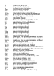 275 Corylus colurna (Baumhasel) 116 Ginkgo biloba (Fächerblattbaum) 137 Celtis australis (Südlicher Zürgelbaum) 10004 Quercus pubescens (Flaumeiche) 10005 Cercis siliquastrum (Judasbaum) 10006 Magnolia grandiflora (Immergrüne Magnolie) 10015/A Prunus virginiana 'Shubert' (Rotblättrige Traubenkirsche) 10016/A Prunus virginiana 'Shubert' (Rotblättrige Traubenkirsche) 10017/A Cercidiphyllum japonicum (Katsurabaum) 11001 Cladrastis lutea (Gelbholz) 11017 Cladrastis lutea (Gelbholz) 12008 Carpinus betulus 'Columnaris' (Pyramidenhainbuche) 2047 Acer platanoides 'Globosum' (Kugelspitzahorn) 2073 Magnolia grandiflora (Immergrüne Magnolie) 2083 Magnolia kobus (Baummagnolie) 2084 Magnolia kobus (Baummagnolie) 2085 Magnolia kobus (Baummagnolie) 2086 Magnolia kobus (Baummagnolie) 2087 Magnolia kobus (Baummagnolie) 2088 Magnolia kobus (Baummagnolie) 2088/A Magnolia kobus (Baummagnolie) 2088/B Magnolia kobus (Baummagnolie) 2088/C Magnolia kobus (Baummagnolie) 2088/F Magnolia kobus (Baummagnolie) 26002/A Ilex aquifolium 'Aurea Marginata' (Gelbgerandete Stechpalme) 26002/B Ilex aquifolium 'Aurea Marginata' (Gelbgerandete Stechpalme) 26002/C Ilex aquifolium 'Aurea Marginata' (Gelbgerandete Stechpalme) 26002/D Ilex aquifolium 'Aurea Marginata' (Gelbgerandete Stechpalme) 3001 Salix babylonica (Trauer-Weide) 31003/A Toona sinensis (Chinesischer Surenbaum) 38012/A Malus hybride 'Professor Sprenger' (Zierapfel) 38012/B Malus hybride 'Professor Sprenger' (Zierapfel) 38012/C Prunus serrulata 'Kiki-shidare-zakura' (Jap.Hänge Nelkenkirsche) 38012/D Prunus serrulata 'Kiki-shidare-zakura' (Jap.Hänge Nelkenkirsche) 40003/A Magnolia 'Royal Crown' (Magnolie) 40006 Magnolia x soulangiana (Tulpenmagnolie) 40007 Malus hybrida 'Royalty' (Blutapfel) 40008 Malus hybrida 'Royalty' (Blutapfel) 42001 Sequoiadendron giganteum (Mammutbaum) 42016 Fagus sylvatica 'Roseomarginata' (Buntblättrige Buche) 43004 Quercus frainetto (Ungarische Eiche) 43004/A Quercus frainetto (Ungarische Eiche) 43005 Quercus frainetto (Ungarische Eiche) 44004 Aesculus x carnea 'Briotii' (Scharlachkastanie) 49030 Albizia julibrissin 'Ombrella' (Schirm-Seidenakazie) 49031 Albizia julibrissin 'Ombrella' (Schirm-Seidenakazie) 7063/A Cedrus atlantica 'Glauca' (Blaue Atlaszeder) 7063/B Cedrus atlantica 'Glauca' (Blaue Atlaszeder) 7063/C Cedrus atlantica 'Glauca' (Blaue Atlaszeder) 7112 Betula pendula (Weißbirke) 7114/A Acer truncatum 'Pacific Sunset' (Pazifischer Ahorn)