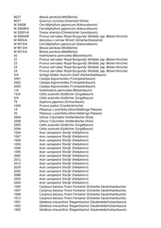 97 Fraxinus angustifolia 'Raywood' (Schmalblättrige Esche) 1/M Morus alba (Weißer Maulbeerbaum) 2/M Fraxinus excelsior (Gemeine Esche) 28 Malus hybride 'John Downie' (Zierapfel) 34 Ulmus 'Columella' (Holländische Ulme) 5/A Zelkova spec. (Zelkove) 27 Albizia julibrissin (Seidenakazie) 33 Aesculus x carnea 'Briotii' (Scharlachkastanie) 3036 Cercidiphyllum japonicum (Katsurabaum) 4014 Acer campestre (Feldahorn) 4028 Prunus cerasifera 'Nigra' (Blutpflaume) 102 Acer platanoides 'Eurostar' (Spitzahorn) 108 Acer platanoides 'Eurostar' (Spitzahorn) 11/A Albizia julibrissin (Seidenakazie) 111 Ulmus 'New Horizon' (Resista Ulme) 113 Ulmus 'New Horizon' (Resista Ulme) 114 Ulmus 'New Horizon' (Resista Ulme) 31/A Prunus subhirtella 'Autumnalis' (Weiße Winterkirsche) 32 Prunus serrulata 'Kanzan' (Japanische Blütenkirsche) 38/A Koelreuteria paniculata 'Fastigiata' (Säulenblasenbaum) 39 Malus spec. (Apfelbaum) 41 Tilia cordata 'Greenspire' (Stadtlinde) 41/A Robinia x slavinii 'Hillieri' (Hohe Rosenakazie) 41/C Cercidiphyllum japonicum (Katsurabaum) 49/A Zelkova serrata 'Musashino' (Musashino-Zelkove) 65 Quercus rubra (Roteiche) 10 Malus hybride 'John Downie' (Zierapfel) 22/B Carpinus betulus 'Columnaris' (Pyramidenhainbuche) 4 Ulmus 'New Horizon' (Resista Ulme) 101 Acer platanoides 'Eurostar' (Spitzahorn) 121 Liriodendron tulipifera (Tulpenbaum) 123 Carpinus betulus 'Frans Fontaine' (Schlanke Säulenhainbuche) 136 Koelreuteria paniculata (Blasenbaum) 140/A Carpinus betulus 'Frans Fontaine' (Schlanke Säulenhainbuche) 143 Fraxinus excelsior (Gemeine Esche) 156 Carpinus betulus 'Columnaris' (Pyramidenhainbuche) 23 Acer platanoides 'Columnare' (Säulenahorn) 25/A Acer platanoides 'Columnare' (Säulenahorn) 88 Acer platanoides 'Eurostar' (Spitzahorn) 99 Acer platanoides (Spitzahorn) 1011 Sophora japonica 'Regent' (Pagodenschnurbaum) 1012 Sophora japonica 'Regent' (Pagodenschnurbaum) 1013 Sophora japonica 'Regent' (Pagodenschnurbaum) 1015 Fraxinus ornus 'Obelisk' (Säulenblumenesche) 1024 Sophora japonica (Schnurbaum) 3036 Prunus sargentii (Scharlachkirsche) 4066 Prunus sargentii (Scharlachkirsche) 8/A Acer platanoides (Spitzahorn) 8/B Celtis australis (Südlicher Zürgelbaum) 17/A Prunus sargentii (Scharlachkirsche) 149 Corylus colurna (Baumhasel)