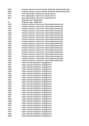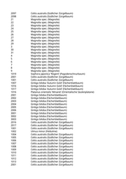 2002 Celtis australis (Südlicher Zürgelbaum) 2003 Celtis australis (Südlicher Zürgelbaum) 2004 Celtis australis (Südlicher Zürgelbaum) 2005 Celtis australis (Südlicher Zürgelbaum) 2006 Celtis australis (Südlicher Zürgelbaum) 2007 Celtis australis (Südlicher Zürgelbaum) 2008 Celtis australis (Südlicher Zürgelbaum) 2009 Celtis australis (Südlicher Zürgelbaum) 2010 Celtis australis (Südlicher Zürgelbaum) 2011 Celtis australis (Südlicher Zürgelbaum) 1015 Tilia x europaea 'Pallida' (Kaiserlinde) 1021/A Tilia spec. (Linde) 1022 Tilia x europaea 'Pallida' (Kaiserlinde) 1024 Tilia x europaea 'Pallida' (Kaiserlinde) 1050 Tilia x europaea 'Pallida' (Kaiserlinde) 2009 Acer platanoides 'Columnare' (Säulenahorn) 1010 Acer campestre 'Elsrijk' (Feldahorn) 2002 Acer campestre 'Elsrijk' (Feldahorn) 2005 Pyrus calleryana 'Chanticleer' (Zierbirne) 2017 Pyrus calleryana 'Chanticleer' (Zierbirne) 1011 Fraxinus angustifolia 'Raywood' (Schmalblättrige Esche) 2009 Fraxinus angustifolia 'Raywood' (Schmalblättrige Esche) 2007 Fraxinus spec. (Esche) 1001 Gleditsia spec. (Lederhülsenbaum) 1069 Acer platanoides 'Columnare' (Säulenahorn) 2016 Acer platanoides 'Columnare' (Säulenahorn) 2023 Acer platanoides 'Columnare' (Säulenahorn) 2027 Acer platanoides 'Columnare' (Säulenahorn) 2074 Acer platanoides 'Columnare' (Säulenahorn) 1016 Celtis australis (Südlicher Zürgelbaum) 1017 Celtis australis (Südlicher Zürgelbaum) 1018 Celtis australis (Südlicher Zürgelbaum) 1019 Celtis australis (Südlicher Zürgelbaum) 1020 Celtis australis (Südlicher Zürgelbaum) 2008 Fraxinus spec. (Esche) 2009 Fraxinus spec. (Esche) 1002 Aesculus x carnea 'Briotii' (Scharlachkastanie) 1011 Aesculus x carnea 'Briotii' (Scharlachkastanie) 1021 Celtis australis (Südlicher Zürgelbaum) 1022 Celtis australis (Südlicher Zürgelbaum) 1023 Celtis australis (Südlicher Zürgelbaum) 2008 Sophora spec. (Schnurbaum) 2011 Sophora japonica (Schnurbaum) 2014 Sophora japonica (Schnurbaum) 2015 Sophora japonica (Schnurbaum) 2018 Sophora japonica (Schnurbaum) 2019 Sophora japonica (Schnurbaum) 2022 Sophora japonica (Schnurbaum) 2023 Sophora japonica (Schnurbaum) 2025 Sophora japonica (Schnurbaum) 2026 Sophora japonica (Schnurbaum)