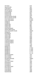 Schröttergasse 2008 Sibeliusstraße 2013/A Sibeliusstraße 2013/B Stefan-Fadinger-Platz 1013 Stefan-Fadinger-Platz 1013 Stefan-Fadinger-Platz 1019/A Stefan-Fadinger-Platz 1026 Stefan-Fadinger-Platz 1039 Stichstraße 1001 Teichgasse 1001 Thomas-Münzer-Gasse 2002 Troststraße 1010 Troststraße 1014 Tyrnauer Gasse 2010 Uhligstraße 1015 Unter-Laaer Straße 1017 Van-der-Nüll-Gasse 2007 Vivaldigasse 1001 Vivaldigasse 2001 Vivaldigasse 2003 Waldgasse 2014/A Weitmosergasse 1007 Wirerstraße 2006 Wirerstraße 2009 Wirerstraße 2011 Wirerstraße 2012 Wirerstraße 2015 1.Haidequerstraße 1029 1.Haidequerstraße 1048 11., Braunhuberpark, MA42 52 11., Braunhuberpark, MA42 8 11., Carsonypark, MA42 25 11., Carsonypark, MA42 32 11., Hans-Paulas-Park, MA42 3/A 11., Herderpark, MA42 2018 11., Herderpark, MA42 5027 11., Herderpark, MA42 5055 11., Herderpark, MA42 6060 11., Herderpark, MA42 6068 11., Hofgartel, MA42 116 11., Hofgartel, MA42 117 11., Hofgartel, MA42 118 11., Hofgartel, MA42 119 11., Hofgartel, MA42 21 11., Hofgartel, MA42 85 11., Hofgartel, MA42 92/A 11., Hyblerpark, MA42 107 11., Hyblerpark, MA42 122/A 11., Hyblerpark, MA42 76 11., Hyblerpark, MA42 82 11., Luise-Montag-Park, MA42 33