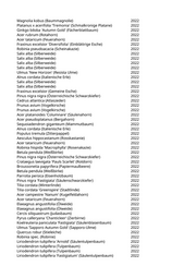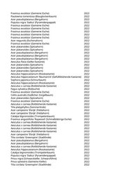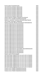 Magnolia kobus (Baummagnolie) 2022 Platanus x acerifolia 'Tremonia' (Schmalkronige Platane) 2022 Ginkgo biloba 'Autumn Gold' (Fächerblattbaum) 2022 Acer rubrum (Rotahorn) 2022 Acer tataricum (Feuerahorn) 2022 Fraxinus excelsior 'Diversifolia' (Einblättrige Esche) 2022 Robinia pseudoacacia (Scheinakazie) 2022 Salix alba (Silberweide) 2022 Salix alba (Silberweide) 2022 Salix alba (Silberweide) 2022 Salix alba (Silberweide) 2022 Ulmus 'New Horizon' (Resista Ulme) 2022 Alnus cordata (Italienische Erle) 2022 Salix alba (Silberweide) 2022 Salix alba (Silberweide) 2022 Fraxinus excelsior (Gemeine Esche) 2022 Pinus nigra nigra (Österreichische Schwarzkiefer) 2022 Cedrus atlantica (Atlaszeder) 2022 Prunus avium (Vogelkirsche) 2022 Prunus avium (Vogelkirsche) 2022 Acer platanoides 'Columnare' (Säulenahorn) 2022 Acer pseudoplatanus (Bergahorn) 2022 Sequoiadendron giganteum (Mammutbaum) 2022 Alnus cordata (Italienische Erle) 2022 Populus tremula (Zitterpappel) 2022 Aesculus hippocastanum (Rosskastanie) 2022 Acer tataricum (Feuerahorn) 2022 Robinia hispida 'Macrophylla' (Rosenakazie) 2022 Betula pendula (Weißbirke) 2022 Pinus nigra nigra (Österreichische Schwarzkiefer) 2022 Crataegus laevigata 'Pauls Scarlet' (Rotdorn) 2022 Broussonetia papyrifera (Papiermaulbeere) 2022 Betula pendula (Weißbirke) 2022 Parrotia persica (Eisenholzbaum) 2022 Pinus nigra 'Fastigiata' (Säulenschwarzkiefer) 2022 Tilia cordata (Winterlinde) 2022 Tilia cordata 'Greenspire' (Stadtlinde) 2022 Acer campestre 'Nanum' (Kugelfeldahorn) 2022 Acer tataricum (Feuerahorn) 2022 Elaeagnus angustifolia (Ölweide) 2022 Elaeagnus angustifolia (Ölweide) 2022 Cercis siliquastrum (Judasbaum) 2022 Pyrus calleryana 'Chanticleer' (Zierbirne) 2022 Koelreuteria paniculata 'Fastigiata' (Säulenblasenbaum) 2022 Ulmus 'Sapporo Autumn Gold' (Sapporo-Ulme) 2022 Quercus robur (Stieleiche) 2022 Robinia spec. (Robinie) 2022 Liriodendron tulipifera 'Arnold' (Säulentulpenbaum) 2022 Liriodendron tulipifera (Tulpenbaum) 2022 Liriodendron tulipifera (Tulpenbaum) 2022 Liriodendron tulipifera 'Fastigiatum' (Säulentulpenbaum) 2022