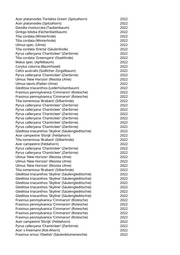 Acer campestre 'Elsrijk' (Feldahorn) 2022 Acer platanoides 'Crimson King' (Blutahorn) 2022 Tilia x europaea 'Pallida' (Kaiserlinde) 2022 Corylus colurna (Baumhasel) 2022 Corylus colurna (Baumhasel) 2022 Fraxinus pennsylvanica 'Summit' (Rotesche) 2022 Acer campestre (Feldahorn) 2022 Pyrus calleryana 'Chanticleer' (Zierbirne) 2022 Prunus sargentii 'Rancho' (Scharlachkirsche) 2022 Acer campestre 'Huibers Elegant' (Feldahorn) 2022 Acer campestre 'Huibers Elegant' (Feldahorn) 2022 Acer campestre 'Huibers Elegant' (Feldahorn) 2022 Acer campestre 'Huibers Elegant' (Feldahorn) 2022 Liriodendron tulipifera (Tulpenbaum) 2022 Koelreuteria paniculata (Blasenbaum) 2022 Koelreuteria paniculata (Blasenbaum) 2022 Prunus subhirtella 'Accolade' (Jap. Blütenkirsche rosa) 2022 Prunus subhirtella 'Accolade' (Jap. Blütenkirsche rosa) 2022 Catalpa bignonioides (Trompetenbaum) 2022 Prunus subhirtella 'Accolade' (Jap. Blütenkirsche rosa) 2022 Prunus avium 'Plena' (Gefülltblühende Vogelkirsche) 2022 Prunus avium 'Plena' (Gefülltblühende Vogelkirsche) 2022 Prunus avium 'Plena' (Gefülltblühende Vogelkirsche) 2022 Prunus avium 'Plena' (Gefülltblühende Vogelkirsche) 2022 Prunus avium 'Plena' (Gefülltblühende Vogelkirsche) 2022 Prunus avium 'Plena' (Gefülltblühende Vogelkirsche) 2022 Prunus avium 'Plena' (Gefülltblühende Vogelkirsche) 2022 Populus nigra 'Italica' (Pyramidenpappel) 2022 Ostrya carpinifolia (Hopfenbuche) 2022 Carpinus betulus 'Fastigiata' (Säulenhainbuche) 2022 Populus nigra 'Italica' (Pyramidenpappel) 2022 Liriodendron tulipifera 'Arnold' (Säulentulpenbaum) 2022 Platanus x acerifolia (Ahornblättrige Platane) 2022 Platanus x acerifolia (Ahornblättrige Platane) 2022 Platanus x acerifolia (Ahornblättrige Platane) 2022 Salix alba 'Tristis' (Trauerweide) 2022 Aesculus x carnea (Rotblühende Kastanie) 2022 Aesculus x carnea (Rotblühende Kastanie) 2022 Aesculus x carnea (Rotblühende Kastanie) 2022 Acer platanoides 'Olmstedt' (Säulenspitzahorn) 2022 Albizia julibrissin (Seidenakazie) 2022 Albizia julibrissin (Seidenakazie) 2022 Albizia julibrissin (Seidenakazie) 2022 Albizia julibrissin (Seidenakazie) 2022 Cupressus sempervierens 'Pyramidalis' (Echte Zypresse) 2022 Tilia cordata 'Greenspire' (Stadtlinde) 2022 Betula pendula (Weißbirke) 2022 Betula pendula (Weißbirke) 2022 Betula pendula (Weißbirke) 2022 Betula pendula (Weißbirke) 2022 Betula pendula (Weißbirke) 2022