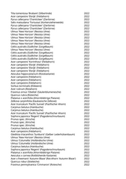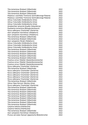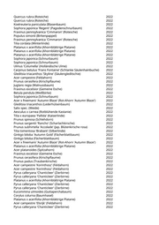 Tilia tomentosa 'Brabant' (Silberlinde) 2022 Acer campestre 'Elsrijk' (Feldahorn) 2022 Pyrus calleryana 'Chanticleer' (Zierbirne) 2022 Salix matsudana 'Tortuosa' (Korkenzieherweide) 2022 Pyrus calleryana 'Chanticleer' (Zierbirne) 2022 Pyrus calleryana 'Chanticleer' (Zierbirne) 2022 Ulmus 'New Horizon' (Resista Ulme) 2022 Ulmus 'New Horizon' (Resista Ulme) 2022 Ulmus 'New Horizon' (Resista Ulme) 2022 Ulmus 'New Horizon' (Resista Ulme) 2022 Ulmus 'New Horizon' (Resista Ulme) 2022 Celtis australis (Südlicher Zürgelbaum) 2022 Ulmus 'New Horizon' (Resista Ulme) 2022 Celtis australis (Südlicher Zürgelbaum) 2022 Celtis australis (Südlicher Zürgelbaum) 2022 Celtis australis (Südlicher Zürgelbaum) 2022 Acer campestre 'Korinthosz' (Feldahorn) 2022 Acer campestre 'Elsrijk' (Feldahorn) 2022 Acer campestre 'Elsrijk' (Feldahorn) 2022 Acer campestre 'Elsrijk' (Feldahorn) 2022 Aesculus hippocastanum (Rosskastanie) 2022 Acer campestre (Feldahorn) 2022 Acer campestre (Feldahorn) 2022 Acer campestre (Feldahorn) 2022 Sorbus torminalis (Elsbeere) 2022 Acer rubrum (Rotahorn) 2022 Fraxinus ornus 'Obelisk' (Säulenblumenesche) 2022 Quercus rubra (Roteiche) 2022 Platanus x acerifolia (Ahornblättrige Platane) 2022 Zelkova carpinifolia (Kaukasische Zelkove) 2022 Acer truncatum 'Pacific Sunset' (Pazifischer Ahorn) 2022 Carpinus betulus (Hainbuche) 2022 Carpinus betulus (Hainbuche) 2022 Acer truncatum 'Pacific Sunset' (Pazifischer Ahorn) 2022 Sophora japonica 'Regent' (Pagodenschnurbaum) 2022 Prunus spec. (Kirsche) 2022 Prunus spec. (Kirsche) 2022 Prunus spec. (Kirsche) 2022 Carpinus betulus (Hainbuche) 2022 Acer campestre (Feldahorn) 2022 Gleditsia triacanthos 'Sunburst' (Gelber Lederhülsenbaum) 2022 Ulmus 'New Horizon' (Resista Ulme) 2022 Ulmus 'Columella' (Holländische Ulme) 2022 Ulmus 'Columella' (Holländische Ulme) 2022 Carpinus betulus (Hainbuche) 2022 Sophora japonica 'Regent' (Pagodenschnurbaum) 2022 Platanus x acerifolia (Ahornblättrige Platane) 2022 Aesculus x carnea (Rotblühende Kastanie) 2022 Acer x freemanii 'Autumn Blaze' (Rot-Ahorn 'Autumn Blaze') 2022 Quercus robur (Stieleiche) 2022 Fraxinus pennsylvanica 'Cimmaron' (Rotesche) 2022