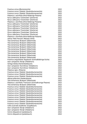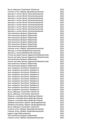 Tilia tomentosa 'Sisi' (Silberlinde) 2022 Catalpa bignonioides (Trompetenbaum) 2022 Pyrus calleryana 'Aristocrat' (Zierbirne) 2022 Celtis australis (Südlicher Zürgelbaum) 2022 Acer campestre 'Korinthosz' (Feldahorn) 2022 Acer campestre 'Korinthosz' (Feldahorn) 2022 Fraxinus ornus 'Obelisk' (Säulenblumenesche) 2022 Fraxinus ornus 'Obelisk' (Säulenblumenesche) 2022 Fraxinus ornus 'Obelisk' (Säulenblumenesche) 2022 Fraxinus ornus 'Obelisk' (Säulenblumenesche) 2022 Carpinus betulus 'Frans Fontaine' (Schlanke Säulenhainbuche) 2022 Carpinus betulus 'Frans Fontaine' (Schlanke Säulenhainbuche) 2022 Betula pendula (Weißbirke) 2022 Paulownia tomentosa (Blauglockenbaum) 2022 Ulmus 'Columella' (Holländische Ulme) 2022 Sorbus aria (Gewöhnliche Mehlbeere) 2022 Carpinus betulus 'Columnaris' (Pyramidenhainbuche) 2022 Gleditsia triacanthos 'Skyline' (Säulengleditschie) 2022 Sorbus aucuparia (Eberesche) 2022 Malus hybrida 'Royalty' (Blutapfel) 2022 Mit Gartenregion abgesprochen, da noch nicht im Kataster 2022 Mit Gartenregion abgesprochen, da noch nicht im Kataster 2022 Mit Gartenregion abgesprochen, da noch nicht im Kataster 2022 Mit Gartenregion abgesprochen, da noch nicht im Kataster 2022 Mit Gartenregion abgesprochen, da noch nicht im Kataster 2022 Mit Gartenregion abgesprochen, da noch nicht im Kataster 2022 Mit Gartenregion abgesprochen, da noch nicht im Kataster 2022 Mit Gartenregion abgesprochen, da noch nicht im Kataster 2022 Mit Gartenregion abgesprochen, da noch nicht im Kataster 2022 Mit Gartenregion abgesprochen, da noch nicht im Kataster 2022 Mit Gartenregion abgesprochen, da noch nicht im Kataster 2022 Mit Gartenregion abgesprochen, da noch nicht im Kataster 2022 Mit Gartenregion abgesprochen, da noch nicht im Kataster 2022 Mit Gartenregion abgesprochen, da noch nicht im Kataster 2022 Mit Gartenregion abgesprochen, da noch nicht im Kataster 2022 Mit Gartenregion abgesprochen, da noch nicht im Kataster 2022 Mit Gartenregion abgesprochen, da noch nicht im Kataster 2022 Mit Gartenregion abgesprochen, da noch nicht im Kataster 2022 Mit Gartenregion abgesprochen, da noch nicht im Kataster 2022 Mit Gartenregion abgesprochen, da noch nicht im Kataster 2022 Mit Gartenregion abgesprochen, da noch nicht im Kataster 2022 Mit Gartenregion abgesprochen, da noch nicht im Kataster 2022 Mit Gartenregion abgesprochen, da noch nicht im Kataster 2022 Mit Gartenregion abgesprochen, da noch nicht im Kataster 2022 Mit Gartenregion abgesprochen, da noch nicht im Kataster 2022 Mit Gartenregion abgesprochen, da noch nicht im Kataster 2022 Mit Gartenregion abgesprochen, da noch nicht im Kataster 2022 Mit Gartenregion abgesprochen, da noch nicht im Kataster 2022 Mit Gartenregion abgesprochen, da noch nicht im Kataster 2022 Mit Gartenregion abgesprochen, da noch nicht im Kataster 2022 Mit Gartenregion abgesprochen, da noch nicht im Kataster 2022