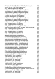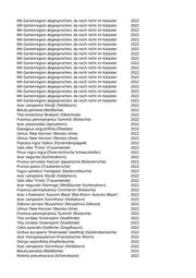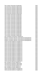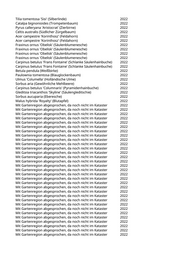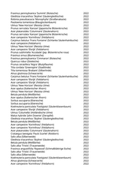 Tilia tomentosa 'Sisi' (Silberlinde) 2022 Catalpa bignonioides (Trompetenbaum) 2022 Pyrus calleryana 'Aristocrat' (Zierbirne) 2022 Celtis australis (Südlicher Zürgelbaum) 2022 Acer campestre 'Korinthosz' (Feldahorn) 2022 Acer campestre 'Korinthosz' (Feldahorn) 2022 Fraxinus ornus 'Obelisk' (Säulenblumenesche) 2022 Fraxinus ornus 'Obelisk' (Säulenblumenesche) 2022 Fraxinus ornus 'Obelisk' (Säulenblumenesche) 2022 Fraxinus ornus 'Obelisk' (Säulenblumenesche) 2022 Carpinus betulus 'Frans Fontaine' (Schlanke Säulenhainbuche) 2022 Carpinus betulus 'Frans Fontaine' (Schlanke Säulenhainbuche) 2022 Betula pendula (Weißbirke) 2022 Paulownia tomentosa (Blauglockenbaum) 2022 Ulmus 'Columella' (Holländische Ulme) 2022 Sorbus aria (Gewöhnliche Mehlbeere) 2022 Carpinus betulus 'Columnaris' (Pyramidenhainbuche) 2022 Gleditsia triacanthos 'Skyline' (Säulengleditschie) 2022 Sorbus aucuparia (Eberesche) 2022 Malus hybrida 'Royalty' (Blutapfel) 2022 Mit Gartenregion abgesprochen, da noch nicht im Kataster 2022 Mit Gartenregion abgesprochen, da noch nicht im Kataster 2022 Mit Gartenregion abgesprochen, da noch nicht im Kataster 2022 Mit Gartenregion abgesprochen, da noch nicht im Kataster 2022 Mit Gartenregion abgesprochen, da noch nicht im Kataster 2022 Mit Gartenregion abgesprochen, da noch nicht im Kataster 2022 Mit Gartenregion abgesprochen, da noch nicht im Kataster 2022 Mit Gartenregion abgesprochen, da noch nicht im Kataster 2022 Mit Gartenregion abgesprochen, da noch nicht im Kataster 2022 Mit Gartenregion abgesprochen, da noch nicht im Kataster 2022 Mit Gartenregion abgesprochen, da noch nicht im Kataster 2022 Mit Gartenregion abgesprochen, da noch nicht im Kataster 2022 Mit Gartenregion abgesprochen, da noch nicht im Kataster 2022 Mit Gartenregion abgesprochen, da noch nicht im Kataster 2022 Mit Gartenregion abgesprochen, da noch nicht im Kataster 2022 Mit Gartenregion abgesprochen, da noch nicht im Kataster 2022 Mit Gartenregion abgesprochen, da noch nicht im Kataster 2022 Mit Gartenregion abgesprochen, da noch nicht im Kataster 2022 Mit Gartenregion abgesprochen, da noch nicht im Kataster 2022 Mit Gartenregion abgesprochen, da noch nicht im Kataster 2022 Mit Gartenregion abgesprochen, da noch nicht im Kataster 2022 Mit Gartenregion abgesprochen, da noch nicht im Kataster 2022 Mit Gartenregion abgesprochen, da noch nicht im Kataster 2022 Mit Gartenregion abgesprochen, da noch nicht im Kataster 2022 Mit Gartenregion abgesprochen, da noch nicht im Kataster 2022 Mit Gartenregion abgesprochen, da noch nicht im Kataster 2022 Mit Gartenregion abgesprochen, da noch nicht im Kataster 2022 Mit Gartenregion abgesprochen, da noch nicht im Kataster 2022 Mit Gartenregion abgesprochen, da noch nicht im Kataster 2022 Mit Gartenregion abgesprochen, da noch nicht im Kataster 2022 Mit Gartenregion abgesprochen, da noch nicht im Kataster 2022