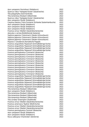 Fraxinus pennsylvanica 'Summit' (Rotesche) 2022 Gleditsia triacanthos 'Skyline' (Säulengleditschie) 2022 Robinia pseudoacacia 'Monophylla' (Straßenakazie) 2022 Paulownia tomentosa (Blauglockenbaum) 2022 Ulmus 'New Horizon' (Resista Ulme) 2022 Prunus serrulata 'Kanzan' (Japanische Blütenkirsche) 2022 Acer platanoides 'Columnare' (Säulenahorn) 2022 Prunus serrulata 'Kanzan' (Japanische Blütenkirsche) 2022 Acer campestre 'Korinthosz' (Feldahorn) 2022 Carpinus betulus 'Frans Fontaine' (Schlanke Säulenhainbuche) 2022 Acer campestre (Feldahorn) 2022 Ulmus 'New Horizon' (Resista Ulme) 2022 Acer campestre 'Elsrijk' (Feldahorn) 2022 Prunus subhirtella 'Accolade' (Jap. Blütenkirsche rosa) 2022 Fraxinus ornus (Blumenesche) 2022 Fraxinus pennsylvanica 'Cimmaron' (Rotesche) 2022 Quercus robur (Stieleiche) 2022 Prunus cerasifera 'Nigra' (Blutpflaume) 2022 Tilia cordata 'Greenspire' (Stadtlinde) 2022 Tilia tomentosa 'Brabant' (Silberlinde) 2022 Alnus glutinosa (Schwarzerle) 2022 Carpinus betulus 'Frans Fontaine' (Schlanke Säulenhainbuche) 2022 Acer campestre 'Elsrijk' (Feldahorn) 2022 Acer campestre 'Elsrijk' (Feldahorn) 2022 Ulmus 'New Horizon' (Resista Ulme) 2022 Acer opalus (Italienischer Ahorn) 2022 Ulmus 'New Horizon' (Resista Ulme) 2022 Betula pendula (Weißbirke) 2022 Acer opalus (Italienischer Ahorn) 2022 Sorbus aucuparia (Eberesche) 2022 Sorbus aucuparia (Eberesche) 2022 Koelreuteria paniculata 'Fastigiata' (Säulenblasenbaum) 2022 Acer campestre 'Elsrijk' (Feldahorn) 2022 Ulmus 'Columella' (Holländische Ulme) 2022 Malus hybride 'John Downie' (Zierapfel) 2022 Gleditsia triacanthos 'Skyline' (Säulengleditschie) 2022 Betula pendula (Weißbirke) 2022 Acer campestre 'Korinthosz' (Feldahorn) 2022 Acer campestre 'Korinthosz' (Feldahorn) 2022 Acer platanoides 'Columnare' (Säulenahorn) 2022 Crataegus laevigata 'Pauls Scarlet' (Rotdorn) 2022 Salix alba (Silberweide) 2022 Gleditsia triacanthos 'Skyline' (Säulengleditschie) 2022 Betula pendula (Weißbirke) 2022 Salix alba 'Tristis' (Trauerweide) 2022 Fraxinus angustifolia 'Raywood' (Schmalblättrige Esche) 2022 Salix alba 'Tristis' (Trauerweide) 2022 Salix alba (Silberweide) 2022 Koelreuteria paniculata 'Fastigiata' (Säulenblasenbaum) 2022 Alnus glutinosa (Schwarzerle) 2022 Acer campestre 'Korinthosz' (Feldahorn) 2022