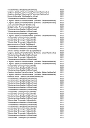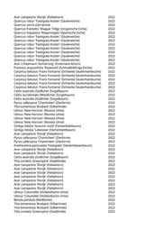 Acer campestre 'Elsrijk' (Feldahorn) 2022 Quercus robur 'Fastigiata Koster' (Säuleneiche) 2022 Quercus cerris (Zerreiche) 2022 Quercus frainetto 'Magyar Tölgy' (Ungarische Eiche) 2022 Quercus hispanica 'Wageningen' (Spanische Eiche) 2022 Quercus robur 'Fastigiata Koster' (Säuleneiche) 2022 Quercus robur 'Fastigiata Koster' (Säuleneiche) 2022 Quercus robur 'Fastigiata Koster' (Säuleneiche) 2022 Quercus robur 'Fastigiata Koster' (Säuleneiche) 2022 Quercus robur 'Fastigiata Koster' (Säuleneiche) 2022 Quercus robur 'Fastigiata Koster' (Säuleneiche) 2022 Quercus robur 'Fastigiata Koster' (Säuleneiche) 2022 Acer x freemanii 'Armstrong' (Freemanii-Ahorn) 2022 Fraxinus angustifolia 'Raywood' (Schmalblättrige Esche) 2022 Carpinus betulus 'Frans Fontaine' (Schlanke Säulenhainbuche) 2022 Carpinus betulus 'Frans Fontaine' (Schlanke Säulenhainbuche) 2022 Carpinus betulus 'Frans Fontaine' (Schlanke Säulenhainbuche) 2022 Carpinus betulus 'Frans Fontaine' (Schlanke Säulenhainbuche) 2022 Carpinus betulus 'Frans Fontaine' (Schlanke Säulenhainbuche) 2022 Celtis australis (Südlicher Zürgelbaum) 2022 Celtis occidentalis (Westlicher Zürgelbaum) 2022 Celtis australis (Südlicher Zürgelbaum) 2022 Pyrus calleryana 'Chanticleer' (Zierbirne) 2022 Tilia tomentosa 'Brabant' (Silberlinde) 2022 Ulmus 'New Horizon' (Resista Ulme) 2022 Ulmus 'New Horizon' (Resista Ulme) 2022 Ulmus 'New Horizon' (Resista Ulme) 2022 Ulmus 'New Horizon' (Resista Ulme) 2022 Ginkgo biloba 'Autumn Gold' (Fächerblattbaum) 2022 Ginkgo biloba 'Lakeview' (Fächerblattbaum) 2022 Acer campestre 'Elsrijk' (Feldahorn) 2022 Pyrus calleryana 'Chanticleer' (Zierbirne) 2022 Pyrus calleryana 'Chanticleer' (Zierbirne) 2022 Koelreuteria paniculata 'Fastigiata' (Säulenblasenbaum) 2022 Acer campestre 'Elsrijk' (Feldahorn) 2022 Acer campestre 'Elsrijk' (Feldahorn) 2022 Celtis australis (Südlicher Zürgelbaum) 2022 Tilia cordata 'Greenspire' (Stadtlinde) 2022 Acer campestre 'Elsrijk' (Feldahorn) 2022 Acer campestre 'Elsrijk' (Feldahorn) 2022 Acer campestre 'Elsrijk' (Feldahorn) 2022 Acer campestre 'Elsrijk' (Feldahorn) 2022 Acer campestre 'Elsrijk' (Feldahorn) 2022 Acer campestre 'Elsrijk' (Feldahorn) 2022 Acer campestre 'Elsrijk' (Feldahorn) 2022 Ulmus 'Columella' (Holländische Ulme) 2022 Ulmus 'Columella' (Holländische Ulme) 2022 Betula pendula (Weißbirke) 2022 Tilia tomentosa 'Brabant' (Silberlinde) 2022 Tilia tomentosa 'Brabant' (Silberlinde) 2022 Tilia cordata 'Greenspire' (Stadtlinde) 2022