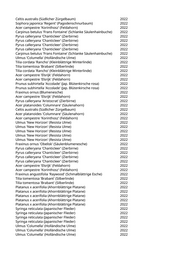 Celtis australis (Südlicher Zürgelbaum) 2022 Sophora japonica 'Regent' (Pagodenschnurbaum) 2022 Acer campestre 'Korinthosz' (Feldahorn) 2022 Carpinus betulus 'Frans Fontaine' (Schlanke Säulenhainbuche) 2022 Pyrus calleryana 'Chanticleer' (Zierbirne) 2022 Pyrus calleryana 'Chanticleer' (Zierbirne) 2022 Pyrus calleryana 'Chanticleer' (Zierbirne) 2022 Pyrus calleryana 'Chanticleer' (Zierbirne) 2022 Carpinus betulus 'Frans Fontaine' (Schlanke Säulenhainbuche) 2022 Ulmus 'Columella' (Holländische Ulme) 2022 Tilia cordata 'Rancho' (Kleinblättrige Winterlinde) 2022 Tilia tomentosa 'Brabant' (Silberlinde) 2022 Tilia cordata 'Rancho' (Kleinblättrige Winterlinde) 2022 Acer campestre 'Elsrijk' (Feldahorn) 2022 Acer campestre 'Elsrijk' (Feldahorn) 2022 Prunus subhirtella 'Accolade' (Jap. Blütenkirsche rosa) 2022 Prunus subhirtella 'Accolade' (Jap. Blütenkirsche rosa) 2022 Fraxinus ornus (Blumenesche) 2022 Acer campestre 'Elsrijk' (Feldahorn) 2022 Pyrus calleryana 'Aristocrat' (Zierbirne) 2022 Acer platanoides 'Columnare' (Säulenahorn) 2022 Celtis australis (Südlicher Zürgelbaum) 2022 Acer platanoides 'Columnare' (Säulenahorn) 2022 Acer campestre 'Korinthosz' (Feldahorn) 2022 Ulmus 'New Horizon' (Resista Ulme) 2022 Ulmus 'New Horizon' (Resista Ulme) 2022 Ulmus 'New Horizon' (Resista Ulme) 2022 Ulmus 'New Horizon' (Resista Ulme) 2022 Ulmus 'New Horizon' (Resista Ulme) 2022 Fraxinus ornus 'Obelisk' (Säulenblumenesche) 2022 Pyrus calleryana 'Chanticleer' (Zierbirne) 2022 Pyrus calleryana 'Chanticleer' (Zierbirne) 2022 Pyrus calleryana 'Chanticleer' (Zierbirne) 2022 Pyrus calleryana 'Chanticleer' (Zierbirne) 2022 Acer campestre 'Elsrijk' (Feldahorn) 2022 Acer campestre 'Korinthosz' (Feldahorn) 2022 Fraxinus angustifolia 'Raywood' (Schmalblättrige Esche) 2022 Tilia tomentosa 'Brabant' (Silberlinde) 2022 Tilia tomentosa 'Brabant' (Silberlinde) 2022 Platanus x acerifolia (Ahornblättrige Platane) 2022 Platanus x acerifolia (Ahornblättrige Platane) 2022 Platanus x acerifolia (Ahornblättrige Platane) 2022 Platanus x acerifolia (Ahornblättrige Platane) 2022 Platanus x acerifolia (Ahornblättrige Platane) 2022 Syringa reticulata (Japanischer Flieder) 2022 Syringa reticulata (Japanischer Flieder) 2022 Syringa reticulata (Japanischer Flieder) 2022 Syringa reticulata (Japanischer Flieder) 2022 Ulmus 'Columella' (Holländische Ulme) 2022 Ulmus 'Columella' (Holländische Ulme) 2022 Ulmus 'Columella' (Holländische Ulme) 2022