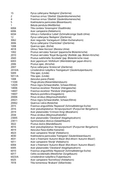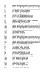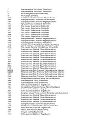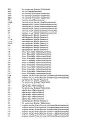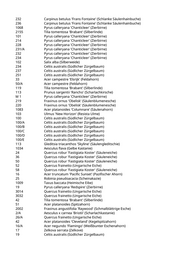 5022 Acer campestre 'Elsrijk' (Feldahorn) 5042 Acer x freemanii 'Autumn Blaze' (Rot-Ahorn 'Autumn Blaze') 5048 Ulmus spec. (Ulme) 5054 Acer x freemanii 'Autumn Blaze' (Rot-Ahorn 'Autumn Blaze') 5057 Celtis australis (Südlicher Zürgelbaum) 1007 Tilia cordata 'Greenspire' (Stadtlinde) 2047 Tilia cordata 'Greenspire' (Stadtlinde) 3013 Carpinus betulus (Hainbuche) 3050 Juglans regia (Walnussbaum) 22 Carpinus betulus 'Frans Fontaine' (Schlanke Säulenhainbuche) 1006 Prunus padus (Traubenkirsche) 1017 Malus hybride 'John Downie' (Zierapfel) 1020 Malus 'Evereste' (Zierapfel) 1023 Malus hybrida 'Royalty' (Blutapfel) 3 Carpinus betulus 'Frans Fontaine' (Schlanke Säulenhainbuche) 2 Acer x freemanii (Rot-Ahorn) 9 Acer x freemanii 'Autumn Blaze' (Rot-Ahorn 'Autumn Blaze') 20 Carpinus betulus 'Frans Fontaine' (Schlanke Säulenhainbuche) 5 Carpinus betulus (Hainbuche) 17 Prunus spinosa (Schlehdorn) 19/A Amelanchier lamarckii (Kupfer-Felsenbirne) 21 Acer platanoides 'Eurostar' (Spitzahorn) 22 Fraxinus ornus 'Obelisk' (Säulenblumenesche) 23 Pyrus calleryana 'Chanticleer' (Zierbirne) 24 Robinia pseudoacacia (Scheinakazie) 40 Amelanchier lamarckii (Kupfer-Felsenbirne) 54 Acer campestre (Feldahorn) 55 Acer campestre (Feldahorn) 1004 Pyrus calleryana 'Redspire' (Zierbirne) 106/A Acer campestre 'Korinthosz' (Feldahorn) 106/B Acer campestre 'Korinthosz' (Feldahorn) 110 Pyrus calleryana 'Redspire' (Zierbirne) 116 Pyrus calleryana 'Redspire' (Zierbirne) 117 Tilia tomentosa 'Brabant' (Silberlinde) 117/B Acer campestre 'Elsrijk' (Feldahorn) 118 Carpinus betulus 'Frans Fontaine' (Schlanke Säulenhainbuche) 209 Acer campestre 'Elsrijk' (Feldahorn) 218 Acer campestre (Feldahorn) 53 Prunus armeniaca (Marille) 2 Pyrus calleryana 'Chanticleer' (Zierbirne) 6001 Pinus wallichiana (Tränenkiefer) 10 Zelkova serrata (Zelkove) 15 Acer campestre 'Elsrijk' (Feldahorn) 1009 Carpinus betulus 'Frans Fontaine' (Schlanke Säulenhainbuche) 1010 Carpinus betulus 'Frans Fontaine' (Schlanke Säulenhainbuche) 1016 Carpinus betulus 'Frans Fontaine' (Schlanke Säulenhainbuche) 1037 Carpinus betulus 'Frans Fontaine' (Schlanke Säulenhainbuche) 1063 Carpinus betulus 'Frans Fontaine' (Schlanke Säulenhainbuche) 2001 Carpinus betulus (Hainbuche) 4022 Acer campestre 'Korinthosz' (Feldahorn) 1 Aesculus x carnea 'Briotii' (Scharlachkastanie)