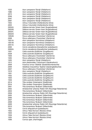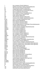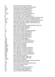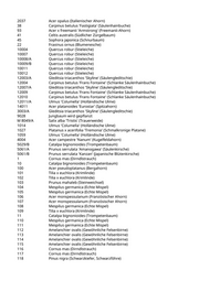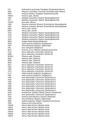 1 Acer campestre 'Elsrijk' (Feldahorn) 2 Gleditsia triacanthos 'Skyline' (Säulengleditschie) 87 Tilia tomentosa 'Brabant' (Silberlinde) 88 Catalpa bignonioides (Trompetenbaum) 29 Acer monspessulanum (Französischer Ahorn) 733 Quercus pubescens (Flaumeiche) 52 Acer campestre 'Nanum' (Kugelfeldahorn) 20 Ulmus 'New Horizon' (Resista Ulme) 26 Fagus sylvatica (Rotbuche) 9/B Tilia tomentosa 'Brabant' (Silberlinde) 9/C Fraxinus ornus 'Obelisk' (Säulenblumenesche) M 9/A Ulmus 'Columella' (Holländische Ulme) 10015 Betula pendula (Weißbirke) 25001 Pinus sylvestris (Gemeine Kiefer) 25009 Pinus sylvestris (Gemeine Kiefer) 29014 Aesculus hippocastanum 'Pyramidalis' (Pyramidenkastanie) 29015 Carpinus betulus (Hainbuche) 29022 Carpinus betulus 'Fastigiata' (Säulenhainbuche) 29045/A Acer campestre (Feldahorn) 29045/B Acer campestre (Feldahorn) 3002 Prunus avium (Vogelkirsche) 3003 Prunus avium (Vogelkirsche) 33005 Acer campestre 'Elsrijk' (Feldahorn) 33006 Acer campestre 'Elsrijk' (Feldahorn) 38034/B Salix alba 'Tristis' (Trauerweide) 39001 Carpinus betulus 'Fastigiata' (Säulenhainbuche) 40001 Prunus avium (Vogelkirsche) 43003/D Prunus serrulata 'Amanogawa' (Säulenkirsche) 46002 Acer campestre 'Elsrijk' (Feldahorn) 47049 Carpinus betulus 'Fastigiata' (Säulenhainbuche) 49126 Cupressus sempervierens 'Pyramidalis' (Echte Zypresse) 49127 Cupressus sempervierens 'Pyramidalis' (Echte Zypresse) 6009/A Alnus spaethii (Purpur-Erle) 6009/B Populus alba (Silberpappel) 6026 Populus tremula (Zitterpappel) 7104/A Tilia tomentosa 'Brabant' (Silberlinde) 7112 Betula pendula (Weißbirke) 8017/A Betula pendula (Weißbirke) 8032/B Betula pendula (Weißbirke) 8046 Pinus nigra (Schwarzkiefer, Schwarzföhre) 8050 Pinus sylvestris (Gemeine Kiefer) 8052 Pinus sylvestris (Gemeine Kiefer) 9001 Cupressocyparis leylandii (Riesenzypresse) 9018 Betula pendula (Weißbirke) M 25003 Pyrus pyraster (Wild-Birne) M 6009/C Alnus spaethii (Purpur-Erle) 54 Gleditsia triacanthos 'Skyline' (Säulengleditschie) 56 Gymnocladus dioicus (Geweihbaum) 8 Acer x freemanii 'Armstrong' (Freemanii-Ahorn) 105 Catalpa bignonioides (Trompetenbaum) 142 Koelreuteria paniculata (Blasenbaum)