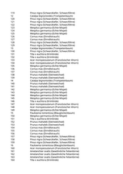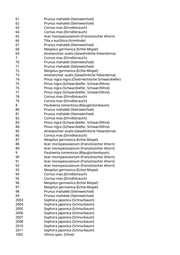119 Pinus nigra (Schwarzkiefer, Schwarzföhre) 12 Catalpa bignonioides (Trompetenbaum) 120 Pinus nigra (Schwarzkiefer, Schwarzföhre) 121 Pinus nigra (Schwarzkiefer, Schwarzföhre) 122 Pinus nigra (Schwarzkiefer, Schwarzföhre) 123 Mespilus germanica (Echte Mispel) 124 Mespilus germanica (Echte Mispel) 125 Mespilus germanica (Echte Mispel) 126 Cornus mas (Dirndlstrauch) 127 Cornus mas (Dirndlstrauch) 128 Pinus nigra (Schwarzkiefer, Schwarzföhre) 129 Pinus nigra (Schwarzkiefer, Schwarzföhre) 13 Catalpa bignonioides (Trompetenbaum) 130 Pinus nigra (Schwarzkiefer, Schwarzföhre) 131 Tilia x euchlora (Krimlinde) 132 Tilia x euchlora (Krimlinde) 133 Acer monspessulanum (Französischer Ahorn) 134 Acer monspessulanum (Französischer Ahorn) 135 Mespilus germanica (Echte Mispel) 136 Cornus mas (Dirndlstrauch) 137 Cornus mas (Dirndlstrauch) 138 Prunus mahaleb (Steinweichsel) 139 Prunus mahaleb (Steinweichsel) 14 Catalpa bignonioides (Trompetenbaum) 140 Prunus mahaleb (Steinweichsel) 141 Prunus mahaleb (Steinweichsel) 142 Mespilus germanica (Echte Mispel) 143 Mespilus germanica (Echte Mispel) 144 Mespilus germanica (Echte Mispel) 145 Mespilus germanica (Echte Mispel) 146 Tilia x euchlora (Krimlinde) 147 Acer monspessulanum (Französischer Ahorn) 148 Acer monspessulanum (Französischer Ahorn) 149 Mespilus germanica (Echte Mispel) 15 Paulownia tomentosa (Blauglockenbaum) 150 Mespilus germanica (Echte Mispel) 151 Tilia x euchlora (Krimlinde) 152 Prunus mahaleb (Steinweichsel) 153 Prunus mahaleb (Steinweichsel) 154 Cornus mas (Dirndlstrauch) 155 Cornus mas (Dirndlstrauch) 156 Cornus mas (Dirndlstrauch) 157 Pinus nigra (Schwarzkiefer, Schwarzföhre) 158 Pinus nigra (Schwarzkiefer, Schwarzföhre) 159 Pinus nigra (Schwarzkiefer, Schwarzföhre) 16 Paulownia tomentosa (Blauglockenbaum) 160 Acer monspessulanum (Französischer Ahorn) 161 Amelanchier ovalis (Gewöhnliche Felsenbirne) 162 Amelanchier ovalis (Gewöhnliche Felsenbirne) 163 Amelanchier ovalis (Gewöhnliche Felsenbirne) 164 Tilia x euchlora (Krimlinde)
