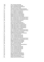 165 Tilia x euchlora (Krimlinde) 166 Prunus mahaleb (Steinweichsel) 17 Morus alba (Weißer Maulbeerbaum) 18 Tilia x euchlora (Krimlinde) 19 Paulownia tomentosa (Blauglockenbaum) 2 Acer monspessulanum (Französischer Ahorn) 20 Cercis siliquastrum (Judasbaum) 21 Cercis siliquastrum (Judasbaum) 22 Cercis siliquastrum (Judasbaum) 23 Mespilus germanica (Echte Mispel) 24 Mespilus germanica (Echte Mispel) 25 Mespilus germanica (Echte Mispel) 26 Acer monspessulanum (Französischer Ahorn) 27 Acer monspessulanum (Französischer Ahorn) 28 Acer monspessulanum (Französischer Ahorn) 29 Parrotia persica (Eisenholzbaum) 3 Cornus mas (Dirndlstrauch) 30 Parrotia persica (Eisenholzbaum) 31 Morus alba (Weißer Maulbeerbaum) 32 Catalpa bignonioides (Trompetenbaum) 33 Catalpa bignonioides (Trompetenbaum) 34 Catalpa bignonioides (Trompetenbaum) 35 Catalpa bignonioides (Trompetenbaum) 36 Cercis siliquastrum (Judasbaum) 37 Acer monspessulanum (Französischer Ahorn) 38 Acer monspessulanum (Französischer Ahorn) 39 Mespilus germanica (Echte Mispel) 4 Paulownia tomentosa (Blauglockenbaum) 40 Tilia x euchlora (Krimlinde) 41 Prunus mahaleb (Steinweichsel) 42 Prunus mahaleb (Steinweichsel) 43 Prunus mahaleb (Steinweichsel) 44 Acer monspessulanum (Französischer Ahorn) 45 Acer monspessulanum (Französischer Ahorn) 46 Mespilus germanica (Echte Mispel) 47 Mespilus germanica (Echte Mispel) 48 Prunus mahaleb (Steinweichsel) 49 Tilia x euchlora (Krimlinde) 5 Paulownia tomentosa (Blauglockenbaum) 50 Tilia x euchlora (Krimlinde) 51 Prunus mahaleb (Steinweichsel) 52 Prunus mahaleb (Steinweichsel) 53 Prunus mahaleb (Steinweichsel) 54 Cornus mas (Dirndlstrauch) 55 Cornus mas (Dirndlstrauch) 56 Cornus mas (Dirndlstrauch) 57 Acer pseudoplatanus (Bergahorn) 58 Mespilus germanica (Echte Mispel) 59 Mespilus germanica (Echte Mispel) 6 Cornus mas (Dirndlstrauch) 60 Mespilus germanica (Echte Mispel)