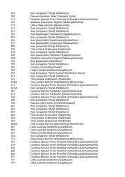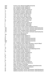 43 Acer pseudoplatanus (Bergahorn) 44 Koelreuteria paniculata (Blasenbaum) 45 Prunus padus (Traubenkirsche) 46 Acer pseudoplatanus (Bergahorn) 47 Koelreuteria paniculata (Blasenbaum) 48 Koelreuteria paniculata (Blasenbaum) 49 Sophora japonica (Schnurbaum) 5 Koelreuteria paniculata (Blasenbaum) 50 Acer pseudoplatanus (Bergahorn) 6 Koelreuteria paniculata (Blasenbaum) 7 Sophora japonica (Schnurbaum) 8 Prunus padus (Traubenkirsche) 9 Sophora japonica (Schnurbaum) 110 Sorbus x thuringiaca 'Fastigiata' (Säulenmehlbeere) 172 Fraxinus angustifolia 'Raywood' (Schmalblättrige Esche) 224 Acer platanoides (Spitzahorn) 232 Fraxinus angustifolia 'Raywood' (Schmalblättrige Esche) 233 Fraxinus angustifolia 'Raywood' (Schmalblättrige Esche) 283 Sorbus x thuringiaca 'Fastigiata' (Säulenmehlbeere) 287 Fraxinus angustifolia 'Raywood' (Schmalblättrige Esche) 327/A Quercus robur (Stieleiche) 335 Gleditsia triacanthos 'Skyline' (Säulengleditschie) 344 Gleditsia triacanthos 'Skyline' (Säulengleditschie) 348 Gleditsia triacanthos 'Skyline' (Säulengleditschie) 362 Quercus robur (Stieleiche) 18 Fraxinus excelsior 'Atlas' (Gemeine Esche) 4 Fraxinus angustifolia 'Raywood' (Schmalblättrige Esche) 102 Betula pendula (Weißbirke) 106 Betula pendula (Weißbirke) 108 Betula pendula (Weißbirke) 49 Catalpa bignonioides (Trompetenbaum) 55 Populus nigra 'Italica' (Pyramidenpappel) 86 Populus nigra 'Italica' (Pyramidenpappel) 52 Aesculus x carnea (Rotblühende Kastanie) 57 Gleditsia triacanthos 'Skyline' (Säulengleditschie) 61 Aesculus x carnea (Rotblühende Kastanie) 75 Ulmus 'Regal' (Resista Ulme) 92 Gleditsia triacanthos 'Skyline' (Säulengleditschie) 15/A Acer campestre (Feldahorn) 115 Fraxinus excelsior 'Altena' (Gemeine Esche) 116 Fraxinus excelsior 'Altena' (Gemeine Esche) 120 Fraxinus angustifolia 'Raywood' (Schmalblättrige Esche) 149 Malus 'Van Eseltine' (Zierapfel) 25/A Fraxinus angustifolia 'Raywood' (Schmalblättrige Esche) 37 Carpinus betulus (Hainbuche) 49 Fraxinus angustifolia 'Raywood' (Schmalblättrige Esche) 52 Fraxinus angustifolia 'Raywood' (Schmalblättrige Esche) 66 Fraxinus angustifolia 'Raywood' (Schmalblättrige Esche) 69 Fraxinus angustifolia 'Raywood' (Schmalblättrige Esche) 80 Acer campestre 'Elsrijk' (Feldahorn) 80/A Fraxinus excelsior 'Atlas' (Gemeine Esche)