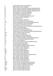 5 Catalpa bignonioides (Trompetenbaum) 8 Malus 'Golden Hornet' (Zierapfel) 47 Sorbus aucuparia 'Sheerwater Seedling' (Säuleneberesche) 50 Sorbus aucuparia 'Sheerwater Seedling' (Säuleneberesche) 53 Sorbus aucuparia 'Sheerwater Seedling' (Säuleneberesche) 26 Ginkgo biloba 'Tremonia' (Säulenginkgo) 61 Pyrus calleryana 'Chanticleer' (Zierbirne) 101 Quercus frainetto (Ungarische Eiche) 19 Fraxinus ornus 'Obelisk' (Säulenblumenesche) 25 Acer campestre 'Elsrijk' (Feldahorn) 3 Ulmus spec. (Ulme) 4 Fraxinus pennsylvanica (Rotesche) 10 Fraxinus pennsylvanica 'Summit' (Rotesche) 73/A Fraxinus angustifolia 'Raywood' (Schmalblättrige Esche) 6 Fraxinus pennsylvanica 'Summit' (Rotesche) 35 Pyrus calleryana 'Chanticleer' (Zierbirne) 4 Gleditsia triacanthos 'Inermis' (Dornenloser Lederhülsenbaum) 6 Corylus colurna (Baumhasel) 46 Acer campestre 'Elsrijk' (Feldahorn) 75 Paulownia tomentosa (Blauglockenbaum) 8 Carpinus betulus 'Frans Fontaine' (Schlanke Säulenhainbuche) 29/A Quercus frainetto (Ungarische Eiche) 10 Carpinus betulus (Hainbuche) 38/A Pyrus calleryana 'Aristocrat' (Zierbirne) 39 Pyrus calleryana 'Chanticleer' (Zierbirne) 59 Fraxinus angustifolia 'Raywood' (Schmalblättrige Esche) 81 Fraxinus ornus 'Meczek' (Kugelblumenesche) 1/A Quercus robur (Stieleiche) 1/B Prunus serrulata 'Kanzan' (Japanische Blütenkirsche) 2/A Aesculus flava (Gelbe Kastanie) 9 Acer pseudoplatanus (Bergahorn) 33 Carpinus betulus 'Fastigiata' (Säulenhainbuche) 1 Acer campestre 'Elsrijk' (Feldahorn) 2/C Acer campestre 'Elsrijk' (Feldahorn) 161 Fraxinus ornus (Blumenesche) 299 Malus hybrida 'Royalty' (Blutapfel) 55/A Acer campestre 'Elsrijk' (Feldahorn) 110 Fraxinus pennsylvanica (Rotesche) 111 Fraxinus excelsior 'Diversifolia' (Einblättrige Esche) 76 Acer campestre 'Elsrijk' (Feldahorn) 77 Malus hybrida 'Royalty' (Blutapfel) 96 Malus hybrida 'Royalty' (Blutapfel) 27 Ulmus 'New Horizon' (Resista Ulme) 121 Acer campestre 'Elsrijk' (Feldahorn) 128/A Carpinus betulus 'Fastigiata' (Säulenhainbuche) 25/A Prunus serrulata 'Amanogawa' (Säulenkirsche) 25/B Fraxinus excelsior 'Westhofs Glorie' (Esche) 4 Quercus frainetto (Ungarische Eiche) 229 Quercus frainetto (Ungarische Eiche) 457/A Quercus frainetto (Ungarische Eiche) 504 Quercus frainetto (Ungarische Eiche)