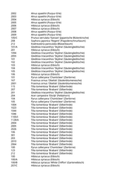 9020 Tilia x europaea 'Pallida' (Kaiserlinde) 9050 Pinus wallichiana (Tränenkiefer) 14 Koelreuteria paniculata (Blasenbaum) 36 Koelreuteria paniculata 'Fastigiata' (Säulenblasenbaum) 83 Pinus sylvestris (Gemeine Kiefer) 2 Prunus padus (Traubenkirsche) 4 Prunus avium 'Plena' (Gefülltblühende Vogelkirsche) 112 Prunus avium 'Plena' (Gefülltblühende Vogelkirsche) 119 Paulownia tomentosa (Blauglockenbaum) 19/A Pinus nigra nigra (Österreichische Schwarzkiefer) 19/B Pinus nigra nigra (Österreichische Schwarzkiefer) 12/A Prunus virginiana 'Shubert' (Rotblättrige Traubenkirsche) 5 Amelanchier lamarckii (Kupfer-Felsenbirne) 2 Koelreuteria paniculata (Blasenbaum) 59 Tilia tomentosa 'Brabant' (Silberlinde) 63 Salix alba 'Tristis' (Trauerweide) 64 Salix alba 'Tristis' (Trauerweide) 75 Pinus wallichiana (Tränenkiefer) 12 Tilia tomentosa 'Brabant' (Silberlinde) 65 Fagus sylvatica 'Atropurpurea' (Blutbuche) 92 Picea orientalis (Kaukasus-Fichte) 20 Carpinus betulus 'Frans Fontaine' (Schlanke Säulenhainbuche) 39/A Pinus wallichiana (Tränenkiefer) 48/A Koelreuteria paniculata 'Fastigiata' (Säulenblasenbaum) 48/B Carpinus betulus 'Frans Fontaine' (Schlanke Säulenhainbuche) 48/C Liriodendron tulipifera 'Fastigiatum' (Säulentulpenbaum) 53 Liriodendron tulipifera 'Arnold' (Säulentulpenbaum) 66 Liriodendron tulipifera (Tulpenbaum) 77/B Koelreuteria paniculata 'Fastigiata' (Säulenblasenbaum) 81/A Liriodendron tulipifera 'Arnold' (Säulentulpenbaum) 82/A Carpinus betulus 'Fastigiata' (Säulenhainbuche) 201 Fraxinus ornus (Blumenesche) 212 Platanus orientalis 'Minaret' (Orientalische Säulenplatane) 214 Platanus orientalis 'Minaret' (Orientalische Säulenplatane) 216 Platanus orientalis 'Minaret' (Orientalische Säulenplatane) 219 Platanus orientalis 'Minaret' (Orientalische Säulenplatane) 220 Platanus orientalis 'Minaret' (Orientalische Säulenplatane) 223 Platanus orientalis 'Minaret' (Orientalische Säulenplatane) 225 Platanus orientalis 'Minaret' (Orientalische Säulenplatane) 226 Platanus orientalis 'Minaret' (Orientalische Säulenplatane) 227 Platanus orientalis 'Minaret' (Orientalische Säulenplatane) 228 Platanus orientalis 'Minaret' (Orientalische Säulenplatane) 233 Prunus sargentii 'Rancho' (Scharlachkirsche) 322 Prunus sargentii 'Rancho' (Scharlachkirsche) 409/A Acer campestre 'Korinthosz' (Feldahorn) 417 Tilia cordata (Winterlinde) 419 Tilia cordata (Winterlinde) 420 Tilia cordata (Winterlinde) 1001 Hibiscus syriacus (Eibisch) 1002 Hibiscus syriacus (Eibisch) 2001 Hibiscus syriacus (Eibisch)