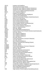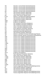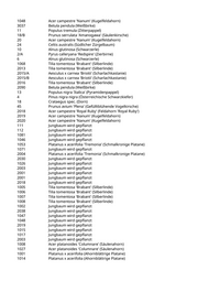 1001/D Jungbaum wird gepflanzt 4002 Salix pentandra (Lorbeer-Weide) 6002 Amelanchier laevis 'Ballerina' (Essbare Felsenbirne) 6030 Amelanchier laevis 'Ballerina' (Essbare Felsenbirne) 7008 Fraxinus ornus 'Obelisk' (Säulenblumenesche) 9013/A Acer campestre (Feldahorn) 1010 Jungbaum wird gepflanzt 2/A Celtis occidentalis (Westlicher Zürgelbaum) 48 Castanea sativa (Edelkastanie) 19/F Koelreuteria paniculata 'Fastigiata' (Säulenblasenbaum) 45/A Quercus cerris (Zerreiche) 21006 Prunus avium (Vogelkirsche) 22034 Picea orientalis (Kaukasus-Fichte) 22052 Picea orientalis (Kaukasus-Fichte) 25022 Prunus sargentii 'Rancho' (Scharlachkirsche) 7016 Pinus brutia (Türkische Kiefer) 8003 Celtis australis (Südlicher Zürgelbaum) 8014 Quercus x kewensis (Eiche) 16020 Salix spec. (Weide) 16023/A Morus alba (Weißer Maulbeerbaum) 3034/A Carpinus betulus 'Frans Fontaine' (Schlanke Säulenhainbuche) 8020/A Acer spec. (Ahorn) 1058/A Acer campestre (Feldahorn) 1059/A Acer campestre (Feldahorn) 1060/A Acer campestre (Feldahorn) 1110/A Acer spec. (Ahorn) 3019 Fraxinus pennsylvanica 'Cimmaron' (Rotesche) 3042 Acer spec. (Ahorn) 5012/A Acer campestre (Feldahorn) 6015 Platanus x acerifolia (Ahornblättrige Platane) 7014 Tilia spec. (Linde) M 3050/E Acer spec. (Ahorn) M 4008/A Fraxinus pennsylvanica 'Cimmaron' (Rotesche) M 4008/B Quercus robur (Stieleiche) M 4013/L Acer spec. (Ahorn) 2038 Robinia pseudoacacia (Scheinakazie) 2040 Quercus petraea (Traubeneiche) 210 Eucommina ulmoides (Guttaperchabaum) 3007/A Quercus robur (Stieleiche) 4/A Tilia tomentosa 'Brabant' (Silberlinde) 4003 Zelkova carpinifolia (Kaukasische Zelkove) M 1/A Cornus mas (Dirndlstrauch) 1/B Carya ovata (Schuppenrinden-Hickorynuss) 1/C Quercus pubescens (Flaumeiche) 31 Gleditsia triacanthos 'Skyline' (Säulengleditschie) 1029 Ulmus 'New Horizon' (Resista Ulme) 1040 Liriodendron tulipifera 'Fastigiatum' (Säulentulpenbaum) 14 Aesculus hippocastanum (Rosskastanie) 7 Morus alba (Weißer Maulbeerbaum) 1 Carya cordiformis (Bitternuss) 1005 Fagus sylvatica 'Roseomarginata' (Buntblättrige Buche)