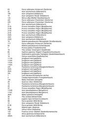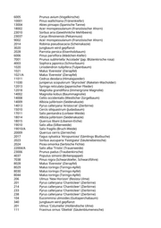 6005 Prunus avium (Vogelkirsche) 10001 Pinus wallichiana (Tränenkiefer) 13004 Abies pinsapo (Spanische Tanne) 18002 Acer monspessulanum (Französischer Ahorn) 23010 Sorbus aria (Gewöhnliche Mehlbeere) 23037 Carya illinoinensis (Pekannuss) 9002 Acer monspessulanum (Französischer Ahorn) 2014 Robinia pseudoacacia (Scheinakazie) 3020 Jungbaum wird gepflanzt 2028 Parrotia persica (Eisenholzbaum) 6006 Pinus parviflora (Mädchen-Kiefer) 7001 Prunus subhirtella 'Accolade' (Jap. Blütenkirsche rosa) 4003 Sophora japonica (Schnurbaum) 1020 Liriodendron tulipifera (Tulpenbaum) 1021 Malus 'Evereste' (Zierapfel) 1021/A Malus 'Evereste' (Zierapfel) 11011 Cedrus deodara (Himalajazeder) 11030 Juniperus scopulorum 'Skyrocket' (Raketen-Wacholder) 12013 Syringa reticulata (Japanischer Flieder) 12018 Magnolia grandiflora (Immergrüne Magnolie) 14002 Magnolia kobus (Baummagnolie) 14008 Celtis occidentalis (Westlicher Zürgelbaum) 14009 Albizia julibrissin (Seidenakazie) 14013 Pyrus calleryana 'Aristocrat' (Zierbirne) 15010 Cercis siliquastrum (Judasbaum) 17011 Salix pentandra (Lorbeer-Weide) 18014 Albizia julibrissin (Seidenakazie) 18015 Quercus libani (Libanon-Eiche) 19010 Salix alba (Silberweide) 19010/A Salix fragilis (Bruch-Weide) 20009 Quercus cerris (Zerreiche) 2017 Fagus sylvatica 'Atropunicea' (Sämlings Blutbuche) 2023 Sorbus aucuparia 'Fastigiata' (Säuleneberesche) 2024 Picea omorika (Serbische Fichte) 22004/A Salix alba 'Tristis' (Trauerweide) 23006 Prunus padus (Traubenkirsche) 4037 Populus simonii (Birkenpappel) 7038 Pinus nigra (Schwarzkiefer, Schwarzföhre) 8028 Malus 'Evereste' (Zierapfel) 8029 Malus toringo (Toringo-Apfel) 8030 Malus toringo (Toringo-Apfel) 8044 Malus toringo (Toringo-Apfel) 206 Ulmus 'New Horizon' (Resista Ulme) 201 Pyrus calleryana 'Chanticleer' (Zierbirne) 214 Pyrus calleryana 'Chanticleer' (Zierbirne) 233 Pyrus calleryana 'Chanticleer' (Zierbirne) 238 Pyrus calleryana 'Chanticleer' (Zierbirne) 104 Eucommina ulmoides (Guttaperchabaum) 340 Jungbaum wird gepflanzt 201 Ulmus 'Columella' (Holländische Ulme) 111 Fraxinus ornus 'Obelisk' (Säulenblumenesche)