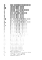 1016 Platanus x acerifolia (Ahornblättrige Platane) 1017 Platanus x acerifolia (Ahornblättrige Platane) 1018 Platanus x acerifolia (Ahornblättrige Platane) 1019 Platanus x acerifolia (Ahornblättrige Platane) 1020 Platanus x acerifolia (Ahornblättrige Platane) 1022 Platanus x acerifolia (Ahornblättrige Platane) 1023 Platanus x acerifolia (Ahornblättrige Platane) 2001 Chitalpa x tashkentensis (Baumoleander) 2002 Chitalpa x tashkentensis (Baumoleander) 2003 Chitalpa x tashkentensis (Baumoleander) 2004 Chitalpa x tashkentensis (Baumoleander) 2005 Platanus x acerifolia (Ahornblättrige Platane) 2006 Platanus x acerifolia (Ahornblättrige Platane) 2007 Platanus x acerifolia (Ahornblättrige Platane) 2008 Platanus x acerifolia (Ahornblättrige Platane) 2009 Platanus x acerifolia (Ahornblättrige Platane) 2010 Platanus x acerifolia (Ahornblättrige Platane) 3025 Ulmus 'New Horizon' (Resista Ulme) 2009 Jungbaum wird gepflanzt 2025 Fraxinus ornus 'Obelisk' (Säulenblumenesche) 1006 Pinus nigra (Schwarzkiefer, Schwarzföhre) 1001 Acer platanoides 'Columnare' (Säulenahorn) 2018 Jungbaum wird gepflanzt 2038 Jungbaum wird gepflanzt 1008 Jungbaum wird gepflanzt 1007 Acer campestre 'Elsrijk' (Feldahorn) 2039 Jungbaum wird gepflanzt 2018 Jungbaum wird gepflanzt 1002 Jungbaum wird gepflanzt 1009 Jungbaum wird gepflanzt 1014 Jungbaum wird gepflanzt 1018 Jungbaum wird gepflanzt 2009 Jungbaum wird gepflanzt 2025 Jungbaum wird gepflanzt 4 Koelreuteria paniculata (Blasenbaum) 217 Fraxinus pennsylvanica 'Summit' (Rotesche) 78/A Acer campestre (Feldahorn) 16 Fraxinus excelsior 'Diversifolia' (Einblättrige Esche) 16 Acer campestre 'Elsrijk' (Feldahorn) 30 Acer campestre 'Elsrijk' (Feldahorn) 11 Celtis australis (Südlicher Zürgelbaum) 12 Catalpa bignonioides (Trompetenbaum) 24 Betula pendula (Weißbirke) 26 Ulmus minor (Feldulme) 36 Jungbaum wird gepflanzt 17/A Paulownia tomentosa (Blauglockenbaum) 23/A Crataegus laevigata (Weißdorn) 55 Ulmus 'New Horizon' (Resista Ulme) 114/B Ulmus 'New Horizon' (Resista Ulme) 114/C Paulownia tomentosa (Blauglockenbaum) 114/D Fraxinus pennsylvanica 'Summit' (Rotesche)