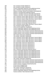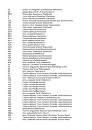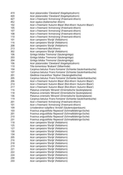 13 Sorbus aria 'Magnifica' (Großblättrige Mehlbeere) 27 Catalpa bignonioides (Trompetenbaum) 80/B Tilia cordata 'Greenspire' (Stadtlinde) 2 Pyrus calleryana 'Chanticleer' (Zierbirne) 3 Pyrus calleryana 'Chanticleer' (Zierbirne) 123 Prunus serrulata 'Royal Burgundy' (Rotblät. Jap. Blüten-Kirsche) 187 Tilia tomentosa 'Brabant' (Silberlinde) 202 Quercus robur 'Fastigiata Koster' (Säuleneiche) 126 Tilia cordata 'Greenspire' (Stadtlinde) 26/A Carpinus betulus (Hainbuche) 26/B Carpinus betulus (Hainbuche) 30/A Acer campestre (Feldahorn) 35/A Carpinus betulus (Hainbuche) 40/A Carpinus betulus (Hainbuche) 42/A Alnus spaethii (Purpur-Erle) 42/B Acer campestre (Feldahorn) 42/C Alnus spaethii (Purpur-Erle) 42/D Tilia tomentosa 'Brabant' (Silberlinde) 42/E Paulownia tomentosa (Blauglockenbaum) 42/F Tilia cordata 'Greenspire' (Stadtlinde) 147 Betula pendula (Weißbirke) 151 Robinia pseudoacacia (Scheinakazie) 157 Robinia pseudoacacia (Scheinakazie) 420 Populus nigra (Schwarzpappel) 474 Acer campestre 'Elsrijk' (Feldahorn) 65 Populus x canadensis (Kanadische Pappel) 75 Fraxinus angustifolia 'Raywood' (Schmalblättrige Esche) 96 Populus alba 'Nivea' (Silberpappel) 56 Acer tataricum (Feuerahorn) 58 Carpinus betulus 'Frans Fontaine' (Schlanke Säulenhainbuche) 59 Carpinus betulus 'Frans Fontaine' (Schlanke Säulenhainbuche) 205 Acer x freemanii 'Armstrong' (Freemanii-Ahorn) 118 Acer campestre 'Elsrijk' (Feldahorn) 111 Corylus colurna (Baumhasel) 113 Corylus colurna (Baumhasel) 175 Corylus colurna (Baumhasel) 176 Corylus colurna (Baumhasel) 181 Corylus colurna (Baumhasel) 226 Acer campestre 'Elsrijk' (Feldahorn) 103 Carpinus betulus 'Frans Fontaine' (Schlanke Säulenhainbuche) 227 Carpinus betulus 'Fastigiata' (Säulenhainbuche) 239 Carpinus betulus 'Frans Fontaine' (Schlanke Säulenhainbuche) 241 Carpinus betulus 'Frans Fontaine' (Schlanke Säulenhainbuche) 255 Carpinus betulus 'Frans Fontaine' (Schlanke Säulenhainbuche) 259 Carpinus betulus 'Frans Fontaine' (Schlanke Säulenhainbuche) 136 Betula pendula (Weißbirke) 108 Fraxinus angustifolia 'Raywood' (Schmalblättrige Esche) 133/A Acer opalus (Italienischer Ahorn) 255 Acer x freemanii 'Autumn Blaze' (Rot-Ahorn 'Autumn Blaze') 102 Carpinus betulus 'Frans Fontaine' (Schlanke Säulenhainbuche) 204 Acer x freemanii 'Autumn Blaze' (Rot-Ahorn 'Autumn Blaze')