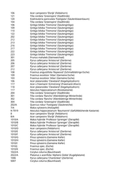 106 Acer campestre 'Elsrijk' (Feldahorn) 121 Tilia cordata 'Greenspire' (Stadtlinde) 120 Koelreuteria paniculata 'Fastigiata' (Säulenblasenbaum) 104 Tilia cordata 'Greenspire' (Stadtlinde) 106 Ginkgo biloba 'Tremonia' (Säulenginkgo) 109 Ginkgo biloba 'Tremonia' (Säulenginkgo) 110 Ginkgo biloba 'Tremonia' (Säulenginkgo) 122 Ginkgo biloba 'Tremonia' (Säulenginkgo) 202 Ginkgo biloba 'Tremonia' (Säulenginkgo) 212 Ginkgo biloba 'Tremonia' (Säulenginkgo) 213 Ginkgo biloba 'Tremonia' (Säulenginkgo) 216 Ginkgo biloba 'Tremonia' (Säulenginkgo) 217 Ginkgo biloba 'Tremonia' (Säulenginkgo) 222 Ginkgo biloba 'Tremonia' (Säulenginkgo) 223 Ginkgo biloba 'Tremonia' (Säulenginkgo) 301 Prunus mahaleb (Steinweichsel) 205 Pyrus calleryana 'Aristocrat' (Zierbirne) 206 Pyrus calleryana 'Aristocrat' (Zierbirne) 207 Pyrus calleryana 'Aristocrat' (Zierbirne) 212 Pyrus calleryana 'Aristocrat' (Zierbirne) 108 Fraxinus angustifolia 'Raywood' (Schmalblättrige Esche) 109 Fraxinus excelsior 'Atlas' (Gemeine Esche) 103 Fraxinus excelsior 'Atlas' (Gemeine Esche) 106 Acer platanoides 'Cleveland' (Kegelspitzahorn) 117 Acer x freemanii 'Armstrong' (Freemanii-Ahorn) 118 Acer platanoides 'Cleveland' (Kegelspitzahorn) 117 Aesculus hippocastanum (Rosskastanie) 204 Tilia cordata 'Greenspire' (Stadtlinde) 301 Tilia cordata 'Rancho' (Kleinblättrige Winterlinde) 302 Tilia cordata 'Rancho' (Kleinblättrige Winterlinde) 304 Tilia cordata 'Greenspire' (Stadtlinde) 202/A Quercus robur 'Fastigiata' (Säuleneiche) 7/A Malus sylvestris (Holzapfel) N 7019 Aesculus hippocastanum 'Baumannii' (Gefülltblühende Kastanie) 8 Acer campestre 'Elsrijk' (Feldahorn) 8/A Acer campestre 'Elsrijk' (Feldahorn) 1010/A Malus hybride 'Professor Sprenger' (Zierapfel) 1010/B Malus hybride 'Professor Sprenger' (Zierapfel) 1010/C Malus hybride 'Professor Sprenger' (Zierapfel) 1010/D Acer campestre (Feldahorn) 1010/E Pyrus calleryana 'Aristocrat' (Zierbirne) 1010/F Pyrus calleryana 'Aristocrat' (Zierbirne) 1010/G Pinus sylvestris (Gemeine Kiefer) 1010/H Pinus sylvestris (Gemeine Kiefer) 1010/I Pinus sylvestris (Gemeine Kiefer) 1010/J Fraxinus spec. (Esche) 1010/K Fraxinus spec. (Esche) 1022/A Corylus colurna (Baumhasel) 2022/A Platanus x acerifolia 'Alphens Globe' (Kugelplatane) 1006 Pyrus calleryana 'Chanticleer' (Zierbirne) 5007 Corylus colurna (Baumhasel)