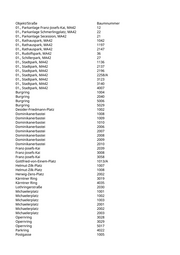 Objekt/Straße Baumnummer 01., Parkanlage Franz-Josefs-Kai, MA42 12 01., Parkanlage Schmerlingplatz, MA42 22 01., Parkanlage Secession, MA42 21 01., Rathauspark, MA42 1042 01., Rathauspark, MA42 1197 01., Rathauspark, MA42 2147 01., Rudolfspark, MA42 36 01., Schillerpark, MA42 27 01., Stadtpark, MA42 1136 01., Stadtpark, MA42 2137 01., Stadtpark, MA42 2196 01., Stadtpark, MA42 2258/A 01., Stadtpark, MA42 3123 01., Stadtpark, MA42 3140 01., Stadtpark, MA42 4007 Burgring 1004 Burgring 2040 Burgring 5006 Burgring 5029 Desider-Friedmann-Platz 1002 Dominikanerbastei 1008 Dominikanerbastei 1009 Dominikanerbastei 1010 Dominikanerbastei 2006 Dominikanerbastei 2007 Dominikanerbastei 2008 Dominikanerbastei 2009 Dominikanerbastei 2010 Franz-Josefs-Kai 2039 Franz-Josefs-Kai 3008 Franz-Josefs-Kai 3058 Gottfried-von-Einem-Platz 1013/A Helmut-Zilk-Platz 1007 Helmut-Zilk-Platz 1008 Herwig-Zens-Platz 2002 Kärntner Ring 3019 Kärntner Ring 4035 Lothringerstraße 2030 Michaelerplatz 1001 Michaelerplatz 1002 Michaelerplatz 1003 Michaelerplatz 2001 Michaelerplatz 2002 Michaelerplatz 2003 Opernring 3028 Opernring 3029 Opernring 5017 Parkring 4022 Postgasse 1005