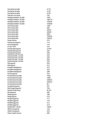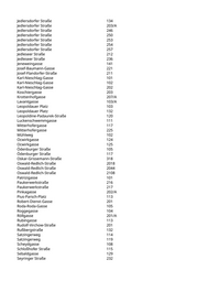 Jedlersdorfer Straße 134 Jedlersdorfer Straße 203/A Jedlersdorfer Straße 246 Jedlersdorfer Straße 250 Jedlersdorfer Straße 253 Jedlersdorfer Straße 254 Jedlersdorfer Straße 257 Jedleseer Straße 212 Jedleseer Straße 236 Jeneweingasse 141 Josef-Baumann-Gasse 221 Josef-Flandorfer-Straße 211 Karl-Nieschlag-Gasse 101 Karl-Nieschlag-Gasse 102 Karl-Nieschlag-Gasse 202 Koschiergasse 203 Krottenhofgasse 207/A Lavantgasse 103/A Leopoldauer Platz 103 Leopoldauer Platz 132 Leopoldine-Padaurek-Straße 120 Luckenschwemmgasse 111 Mitterhofergasse 117 Mitterhofergasse 225 Mühlweg 102 Ocwirkgasse 124 Ocwirkgasse 125 Ödenburger Straße 105 Ödenburger Straße 117 Oskar-Grissemann-Straße 318 Oswald-Redlich-Straße 2018 Oswald-Redlich-Straße 2044 Oswald-Redlich-Straße 2108 Patrizigasse 101 Paukerwerkstraße 216 Paukerwerkstraße 217 Pinkagasse 202/A Pius-Parsch-Platz 113 Robert-Dienst-Gasse 201 Roda-Roda-Gasse 105 Roggegasse 104 Röllgasse 201/A Rubingasse 113 Rudolf-Virchow-Straße 201 Rußbergstraße 132 Satzingerweg 114 Satzingerweg 119 Scheydgasse 108 Schloßhofer Straße 115 Sebaldgasse 129 Seyringer Straße 232