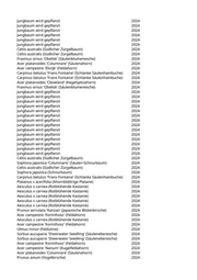 Fagus sylvatica 'Dawyk Purple' (Rotblättrige Säulenblutbuche) 2024 Acer campestre 'Korinthosz' (Feldahorn) 2024 Ginkgo biloba 'Autumn Gold' (Fächerblattbaum) 2024 Fraxinus ornus 'Meczek' (Kugelblumenesche) 2024 Acer campestre 'Nanum' (Kugelfeldahorn) 2024 Salix alba 'Tristis' (Trauerweide) 2024 Robinia pseudoacacia 'Bessioniana' (Kegelakazie) 2024 Carpinus betulus 'Frans Fontaine' (Schlanke Säulenhainbuche) 2024 Carpinus betulus (Hainbuche) 2024 Acer platanoides 'Columnare' (Säulenahorn) 2024 Salix alba 'Tristis' (Trauerweide) 2024 Acer x freemanii 'Autumn Blaze' (Rot-Ahorn 'Autumn Blaze') 2024 Acer platanoides 'Crimson King' (Blutahorn) 2024 Acer platanoides 'Crimson King' (Blutahorn) 2024 Acer opalus (Italienischer Ahorn) 2024 Acer x freemanii 'Armstrong' (Freemanii-Ahorn) 2024 Acer x freemanii 'Autumn Blaze' (Rot-Ahorn 'Autumn Blaze') 2024 Tilia tomentosa 'Brabant' (Silberlinde) 2024 Catalpa bignonioides (Trompetenbaum) 2024 Acer x freemanii 'Armstrong' (Freemanii-Ahorn) 2024 Robinia pseudoacacia (Scheinakazie) 2024 Prunus avium (Vogelkirsche) 2024 Acer saccharinum (Silberahorn) 2024 Sorbus aucuparia 'Sheerwater Seedling' (Säuleneberesche) 2024 Robinia pseudoacacia (Scheinakazie) 2024 Prunus dulcis (Mandelbaum) 2024 Robinia spec. (Robinie) 2024 Robinia spec. (Robinie) 2024 Alnus glutinosa (Schwarzerle) 2024 Prunus serrulata 'Royal Burgundy' (Rotblät. Jap. Blüten-Kirsche) 2024 Acer platanoides 'Crimson King' (Blutahorn) 2024 Fraxinus angustifolia 'Raywood' (Schmalblättrige Esche) 2024 Acer platanoides 'Columnare' (Säulenahorn) 2024 Tilia tomentosa 'Sisi' (Silberlinde) 2024 Corylus colurna 'Granat' (Rotblättrige Baumhasel) 2024 Acer platanoides 'Crimson King' (Blutahorn) 2024 Acer campestre 'Elsrijk' (Feldahorn) 2024 Malus 'Evereste' (Zierapfel) 2024 Quercus robur (Stieleiche) 2024 Tilia tomentosa 'Sisi' (Silberlinde) 2024 Tilia tomentosa 'Brabant' (Silberlinde) 2024 Sophora japonica 'Regent' (Pagodenschnurbaum) 2024 Ginkgo biloba 'Autumn Gold' (Fächerblattbaum) 2024 Jungbaum wird gepflanzt 2024 Sophora japonica 'Regent' (Pagodenschnurbaum) 2024 Jungbaum wird gepflanzt 2024 Cornus kousa (Japanischer Blumen-Hartriegel) 2024 Jungbaum wird gepflanzt 2024 Magnolia kobus (Baummagnolie) 2024 Cedrus atlantica (Atlaszeder) 2024 Jungbaum wird gepflanzt 2024